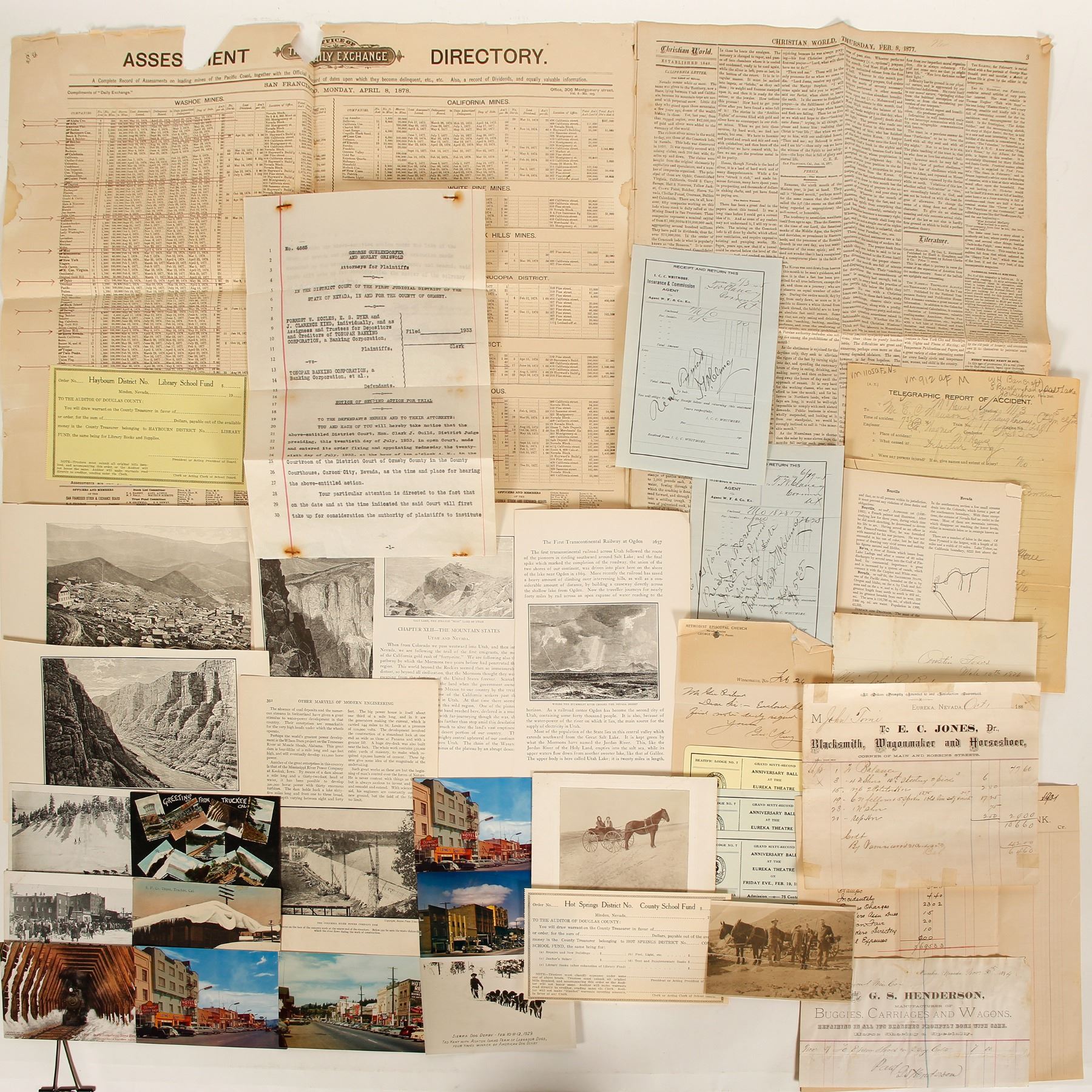 28 pieces of Nevada Ephera including: 5 pictures, notice of setting action for trial, receipt Nov 30, 1894 for new shoes for colts, forms, Bullion & Exchange Bank account, tickets for Anniversary Ball at Eureka Theatre on Feb 19, 1926 - 3, Truckee picture postcards 7. _x000D_