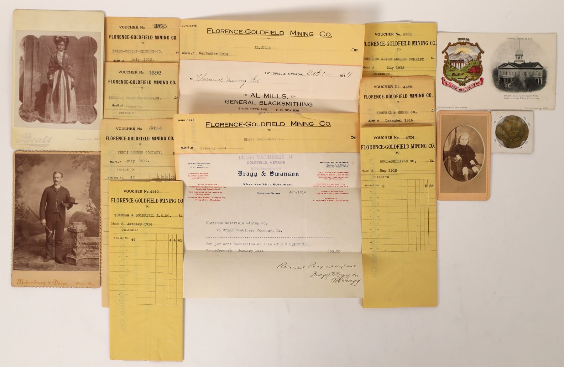 8x Florence Goldfield Mining vouchers, c. 1912-16. Tonopah Club GF $1 Bet scallop token. Photos-Laby by Beals, 4.75x4". Man with hat and cane by Rifenburg & Dowe, 5.5x4". Child by J B Johnson, 3.5x2". Carson City Capitol postcard. Nevada