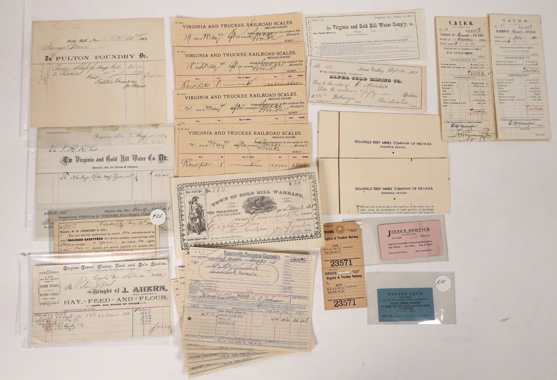 A collection of various ephemera items connected with the state of Nevada. Pieces include, a receipt from a Eureka Hay & Feed store, a receipt from a Gold Hill foundry, receipt for weighing at the V&T Railroad scales at Mound House and more. Interesting slice of Nevada history. Please see photos for more details.