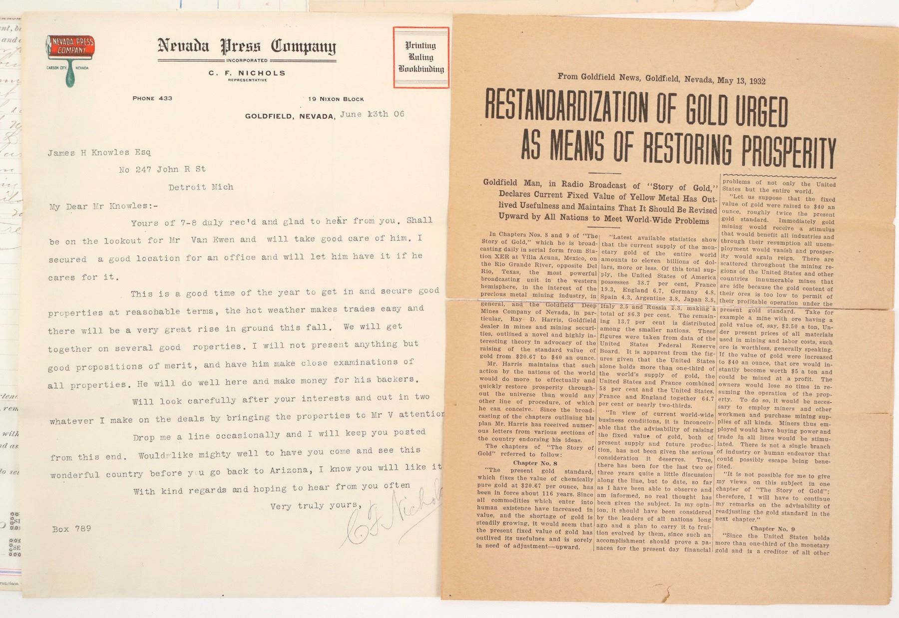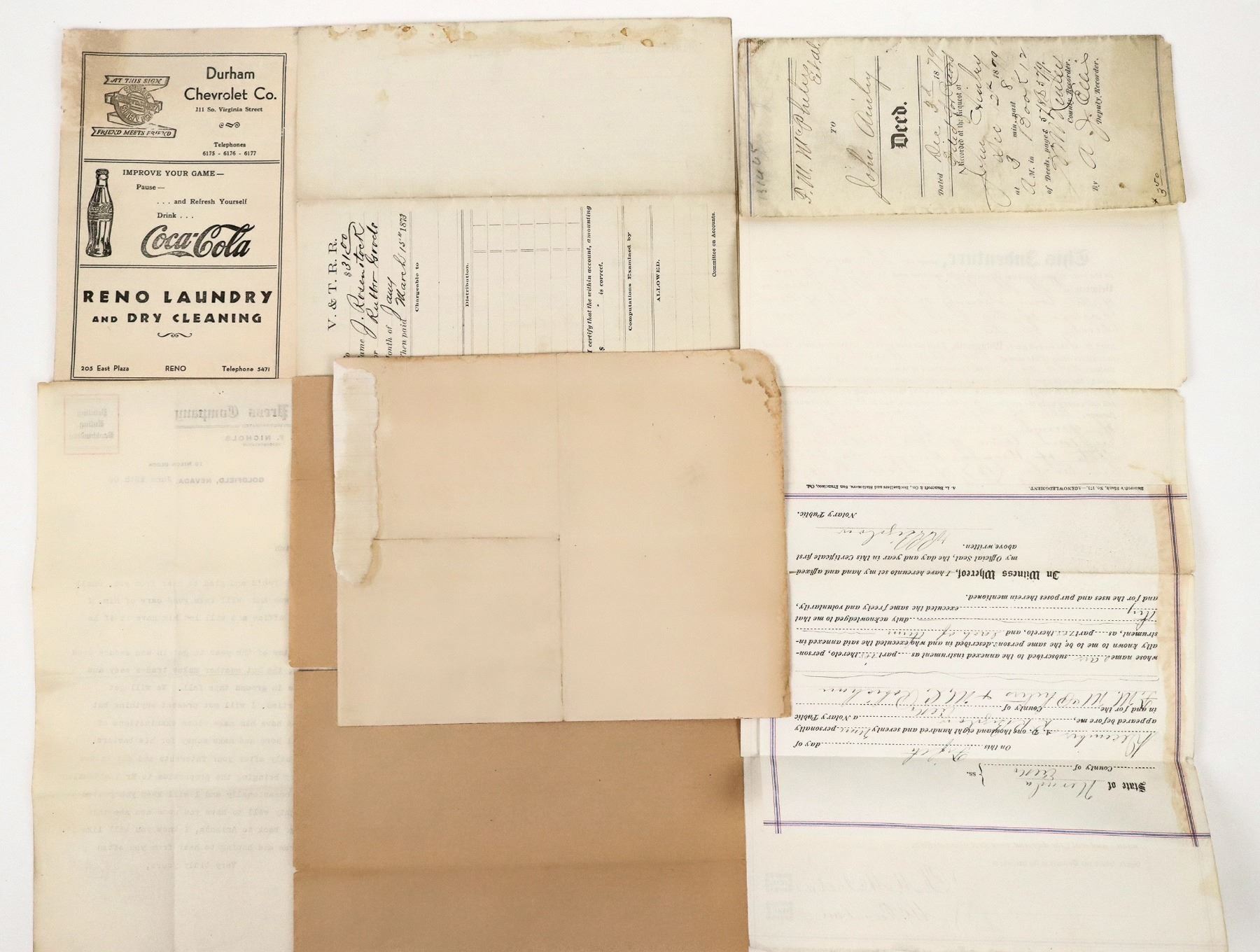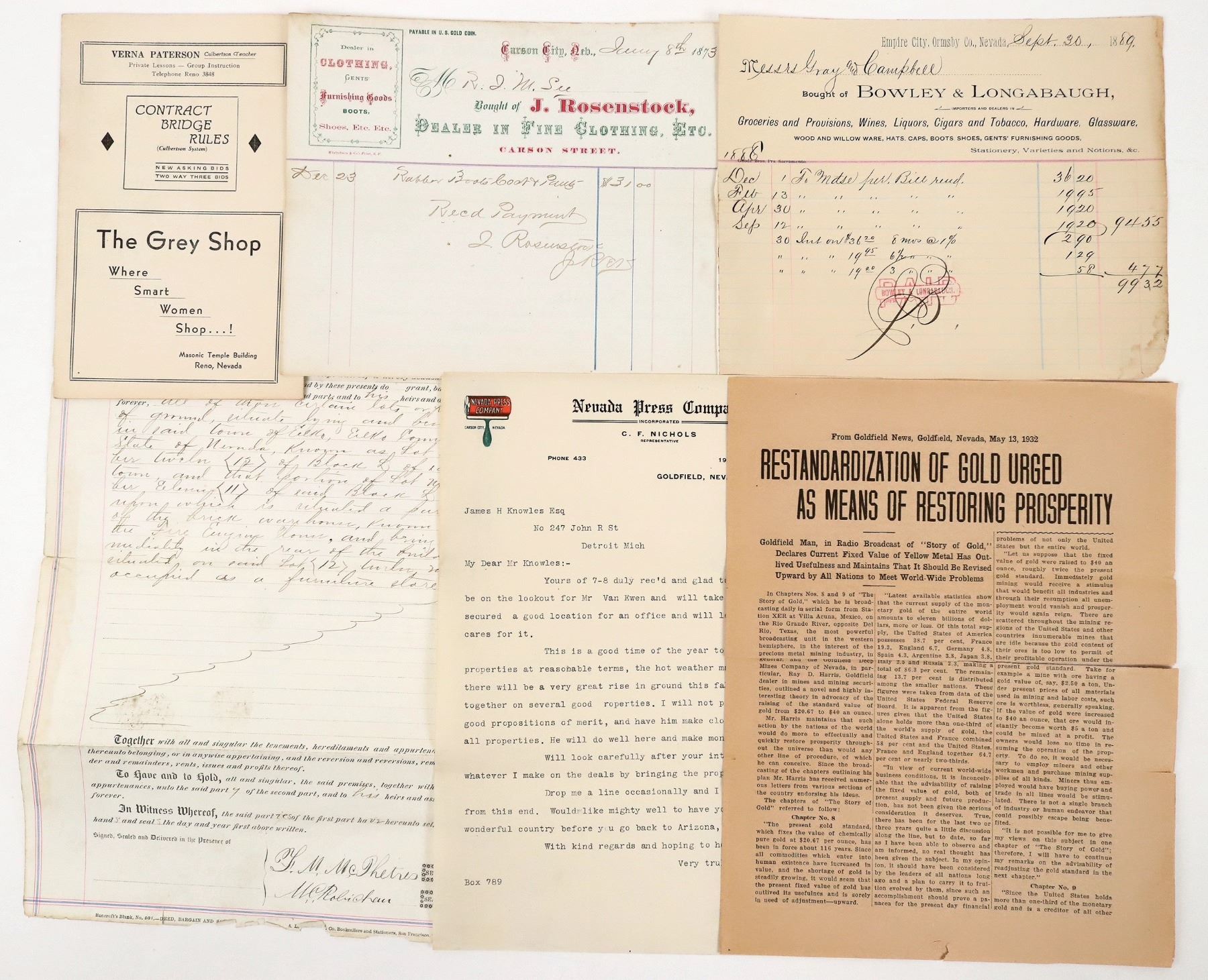 1879 Elko deed, 6x 1880's Carson City post office receipt cards, 1889 Empire City billhead, RARE color 1873 Carson City billhead with V & T RR, 1936 contract bridge rules booklet with Reno advertisers, 1932 Goldfield News, 1906 Goldfield pictorial letterhead.