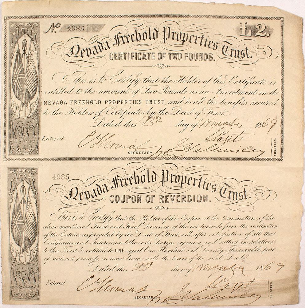 Certificate of two pounds and a coupon of reversion dated November 1869. Uncancelled. British mine financiers seized upon the new discoveries at treasure Hill, have been "left out" of the great Comstock rush, and their failures of understanding the complexities of financing properties during the California Gold Rush. Various British interests ultimately consolidated the best properties into the Eberhardt and Aurora Mining Co. Date: Location: Treasure Hill, Nevada HWAC# 56467