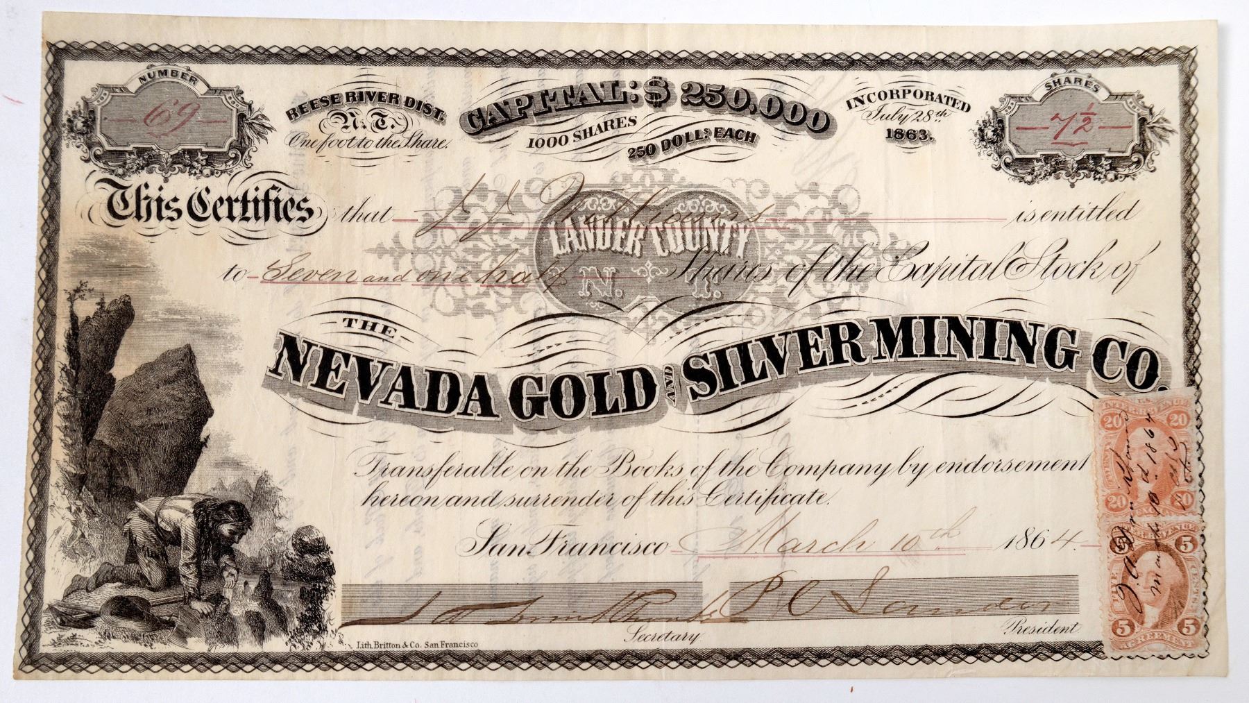 #69 for 7 1/2 shares to J. J. Williams. Signed by P. C. Lander president and J. A. Drinkhouse secretary. Dateline San Francisco 1864. Incorporated July 28, 1863. Small 5c and 20 revenue stamps. Not cancelled. Unique Native American with pick searching for gold vignette. Britton & Co. printer (known for there more interesting vignettes). 'Lander County, N. T.' is inside a heart. Reese River district. No edge, corner, pin hole or discoloration issues. Pleasing to the eye. Lander was original trustee of Gould & Curry and the Yankee. Drinkhouse and Lander were member so the Front Street Consortium. Notes on the two and what the Front Street Consortium was is included. All I found for this company was assessment notices ñ three of them! No production!