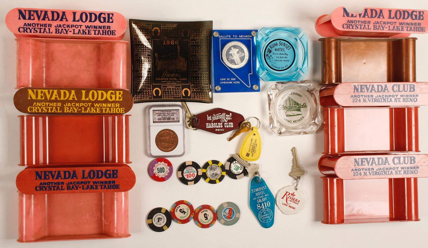 An eclectic group of gaming collectibles. This lot contains approximately 50 Nevada Lodge, Crystal Bay Lake Tahoe and Nevada Club coin holders; casino related key tags ( several gaming chips including$1 Reno's Horseshoe club in black, Cal Neva Nevada Lodge $5 Lake Tahoe, and two Fitzgerald $5, and three casino ashtrays. Also includes three $100 chips, two from the Carousel in Las Vegas and one from the holiday Inn Las Vegas and a beautiful proof Landmark Tower sterling silver $10 gaming token in a Capital Plastics case, 1969. a few others also present including a Nevada Lodge 500 Tahoe. this is a really neat group worthy of looking. HWAC# 62133 Date: Location: Nevada