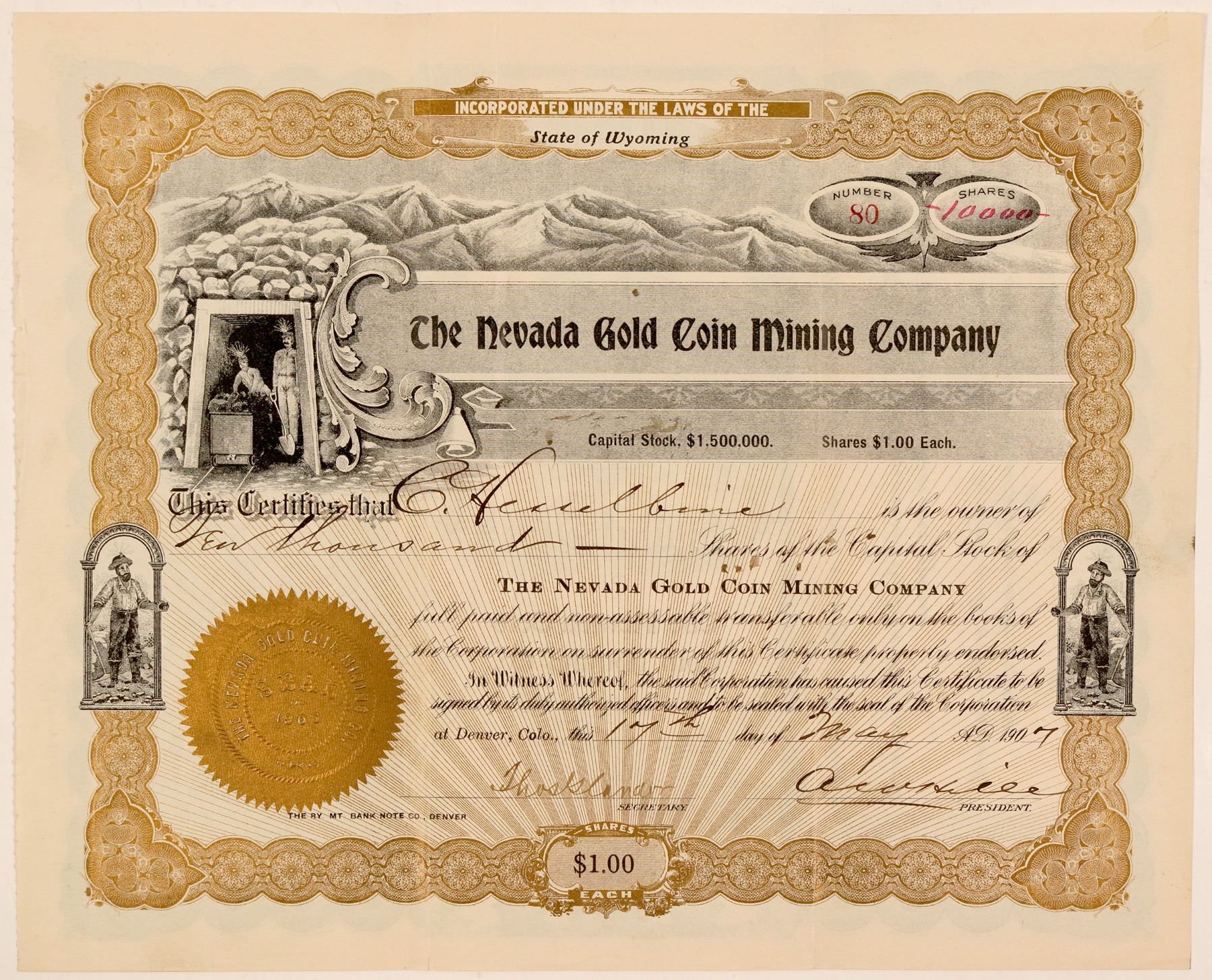 Inc. in Wyoming. Issued at Denver, Colorado in 1907. Two miners at the mine portal at top left and two small miner vignettes on each side. Mountains at the top. Cert. #80, issued for 10,000 shares. Uncancelled.