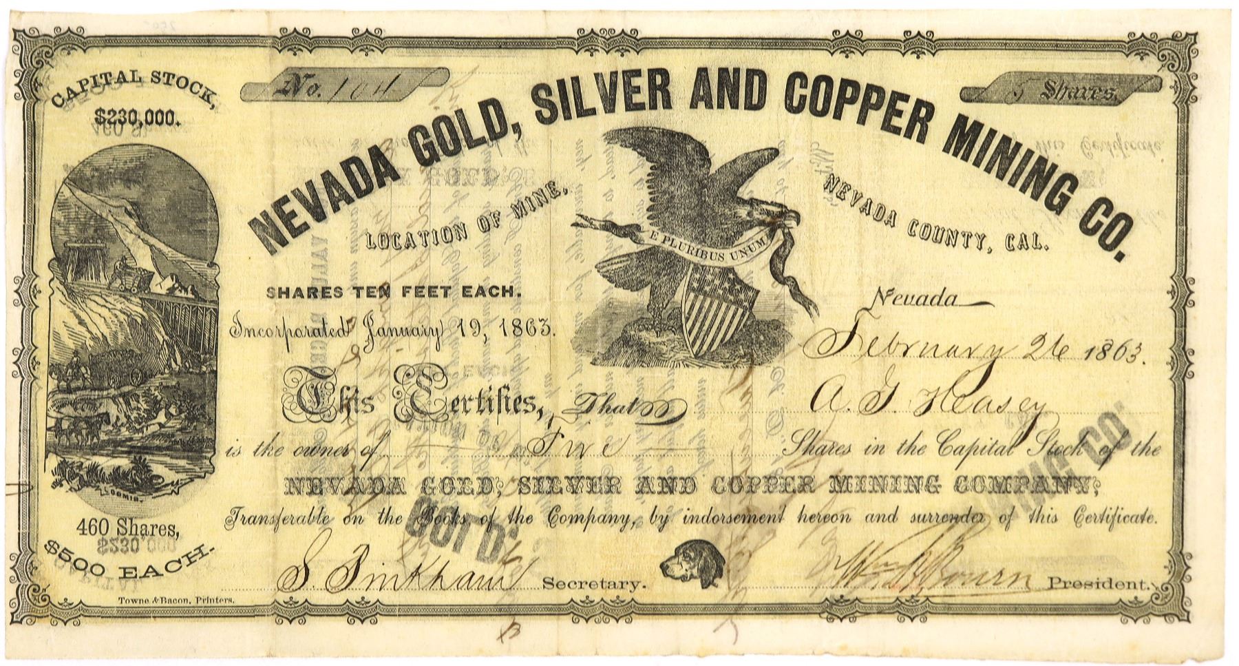 Great eye appeal. Location of Mine, Nevada County, Cal. (printed under title). Inc. January 19, 1863. No. 104, issued for 5 shares to AG Heasey on Feb. 26th, 1863. Dateline Nevada. Signed by Wm. Bourn as president and S. Pinkham as secretary. Not cancelled. Black print and yellow background. Two vignettes: mining vignette by Loomis (left side) and eagle on patriotic shield. Printed by Towne & Bacon. Folds, creases, imprint of title (from being folded). 5.5 x 10.25" Not in Filer. No additional information located on CDNC or newspapers.com (besides mentions of assessments). Nevada County California 1863