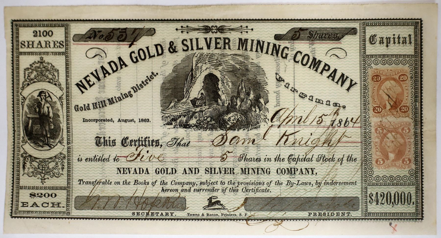 # 537 for 5 shares issued to Samuel Knight on April 15, 1864 in Virginia [City]. Endorsed on reverse by Hopkins. Signed by J. M. Hopkins secretary and (?) president. Incorporated August of 1863. Nice Loomis vignette of miner pushing an ore cart out of a mine. Loomis was a favorite San Francisco lithographer at this time with Towne & Bacon printers. Small 5c and 20c revenue stamps. Printed, "Gold Hill Mining District." Pin holes, one corner fold and one red 'x'. Within 18 months the company had not paid taxes. Knight seems to by the S. F. Wells Fargo supervisor who lost his life in the tremendous nitroglycerin explosion of 1866. G. W. Hopkins was a 20 year Virginia City citizen, grand master of a V. C. lodge, V. C. mayor, and secretary to many mining companies including the Yellow Jacket and Crown Point (notes included).