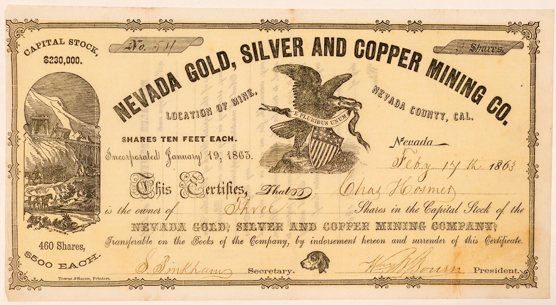 Very rare. Location of Mine, Nevada County, Cal. (printed under title). Inc. January 19, 1863. No. 54, issued to Chas. Hosmer for 3 shares on Feb. 17th, 1863 in Nevada (City). Signed by the president, William Bourn, and secretary S. Pinkham. Not cancelled. Black border and print, yellow background. Two vignettes: eagle on shield (top center) and miners pushing cart out of mine (by Loomis, left side). Printed by Towne & Bacon. 5.5 x 10.25" Folds, two nicked corners, and some small stains. Very nice overall. William Bowers Bourn was a very successful mining engineer who came to California during the Gold Rush. By 1866, he was president of both the Fireman's Fund Insurance Company and the Imperial Silver Mining Company of Gold Hill, Nevada. Over the next three years, he added to his growing fortune with a series of lucrative investments in eastern Nevada's White Pine mining district. In 1869, Bourn capped his career by gaining control of the Empire Mine in Grass Valley. In 1874, however, Bourn shot himself in his SF mansion. His son (of the same name) came to Grass Valley in the 1870s and picked up his father's mantle. () Ken Prag Collection
