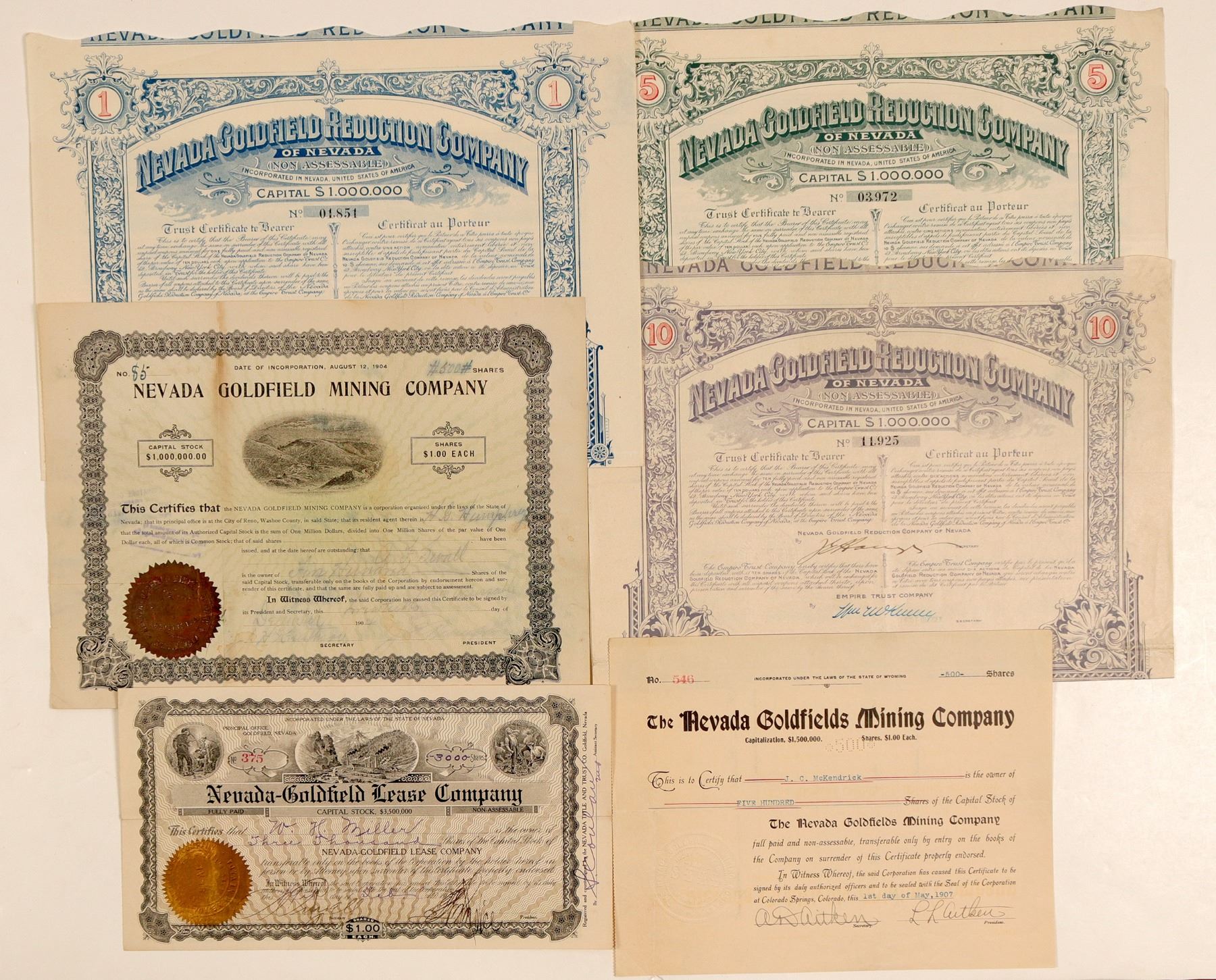 Lot of 6 different. 1) The Nevada Goldfields Mining Company. No. 546, issued in 1907, not cancelled. Heavy folds, toning. 2) Nevada-Goldfield Lease Company. No. 375, issued in 1908, not cancelled. Three mining vignettes. Folds with separation. 3) Nevada Goldfield Mining Company. No. 85, issued in 1904. Folds, water damage, stains. In the 1907 Goldfield Gossip, listed as working the Esmeralda lease. 4) Nevada Goldfield Reduction Company of Nevada. Three different: 1, 5, and 10 share certificates. Text in English and French. Not dated. All have coupons attached. Ken Prag Collection