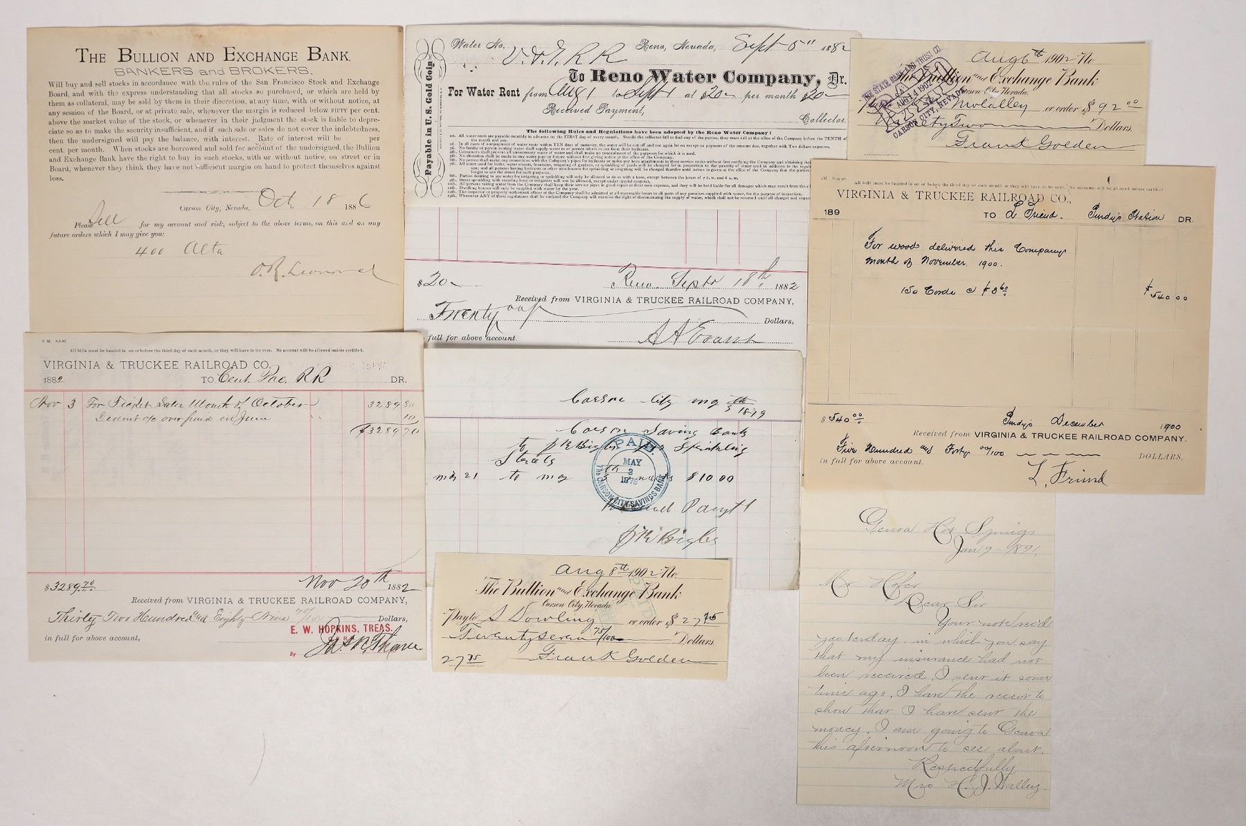 V & TT RR on 2 docs, signed by Henry Yerington, Superintendent of the Virginia & Truckee Rail Road. 1879 Carson City Savings Bank receipt signed by john Bigler, a California governor. 1903 check signed by Sam Davis, a Carson City newspaper editor. 2x 1900 checks signed by Frank Golden, owner of Golden Hotels. 1897 and 1930 First National Bank small letterheads signed by banker George Nixon.