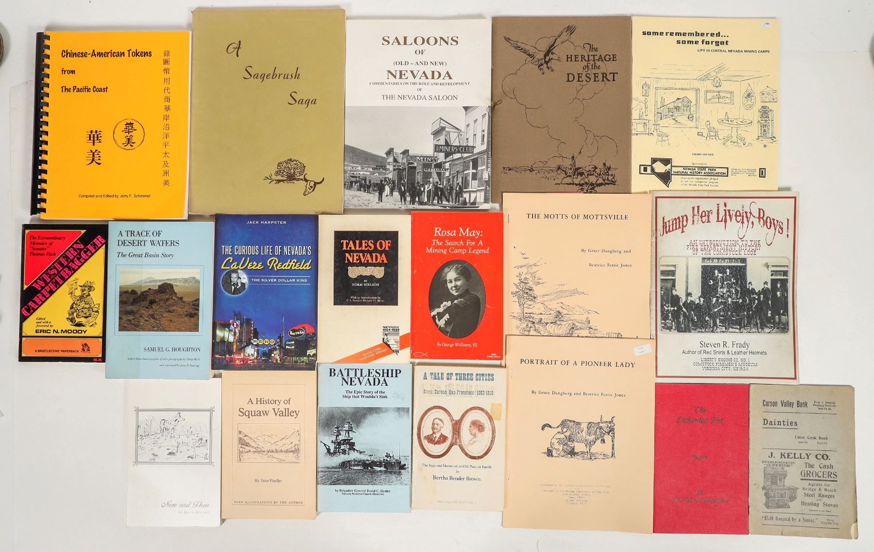 18 Different books on Nevada's historical figures and stories. This collection includes: Western Carpetbagger, Now and Then, A History of Squaw Valley, Rosa may: The Search For A Mining Camp Legend, A Tale of Three Cities: Reno Carson San Francisco, Tales of Nevada, The Curious Life of Nevada's Lavere Redfield, The Enchanted Fort, Battleship Nevada, Carson Valley Bank, Saloons of Old and New Nevada, Chinese American Tokens from the Pacific Coast, Some Remembered Some forgot, Portrait of a Pioneer Lady, The Motts of Mottsville, Jump her lively boys, The Heritage of the Desert, and A Sagebrush Saga.