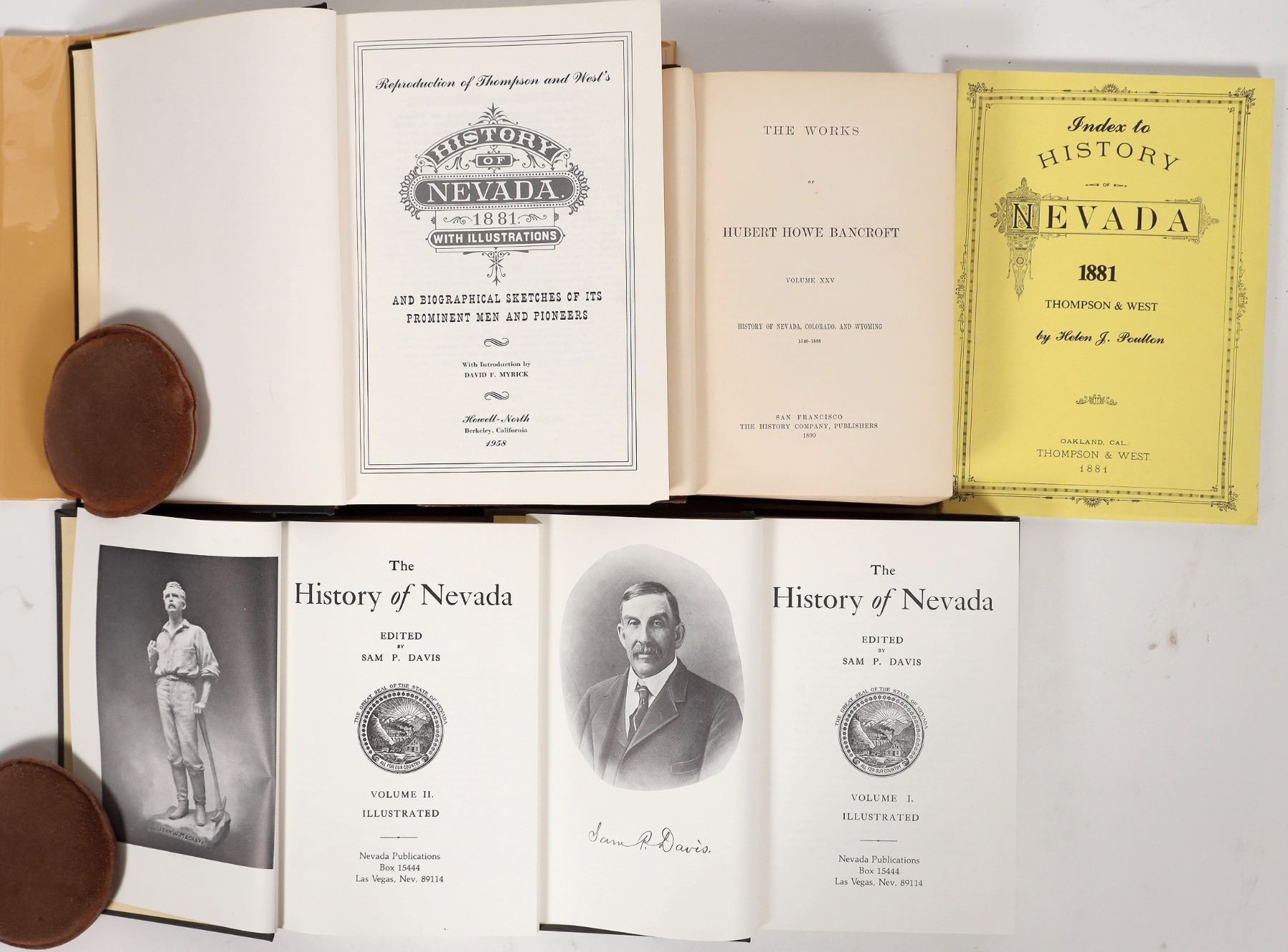 A group of 5 books on Nevada history, published 1890-1966. Titles included in the lot are 'Index to History of Nevada 1881, Thompson & West' by Helen Poulton; 'Bancroft's Works, Volume XXV: Nevada, Colorado, and Wyoming' by Hubert H. Bancroft; volumes 1 and 2 of 'History of Nevada' by Sam P. Davis; and a 1958 reproduction of Thompson and West's 'History of Nevada 1881'. Whole lot is in good condition. Would be a great addition to the library of any Nevada history enthusiast.