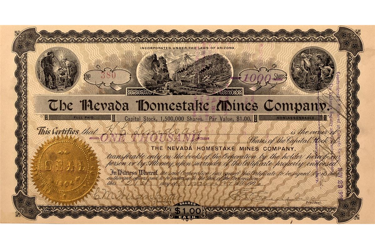 Incorporated in Arizona, 1904. No. 380 issued November 21, 1906 to H. G. Lindsay for 1000 shares. Signed by G. P. Campbell, President and G. M Weisenbinger, Assistant Secretary. No printer. U/C. 10" x 5.5". Black ink on crème paper with three vignettes: upper left is three miners looking at a rock, top center is a factory on a river, and top right is three miners in a shaft. Note: on left margin there is a stamp that says, "Countersigned & Registered at Colorado Springs, Nov. 23, 1906.” There was a mine by this name in Nevada but very little information exists on it.