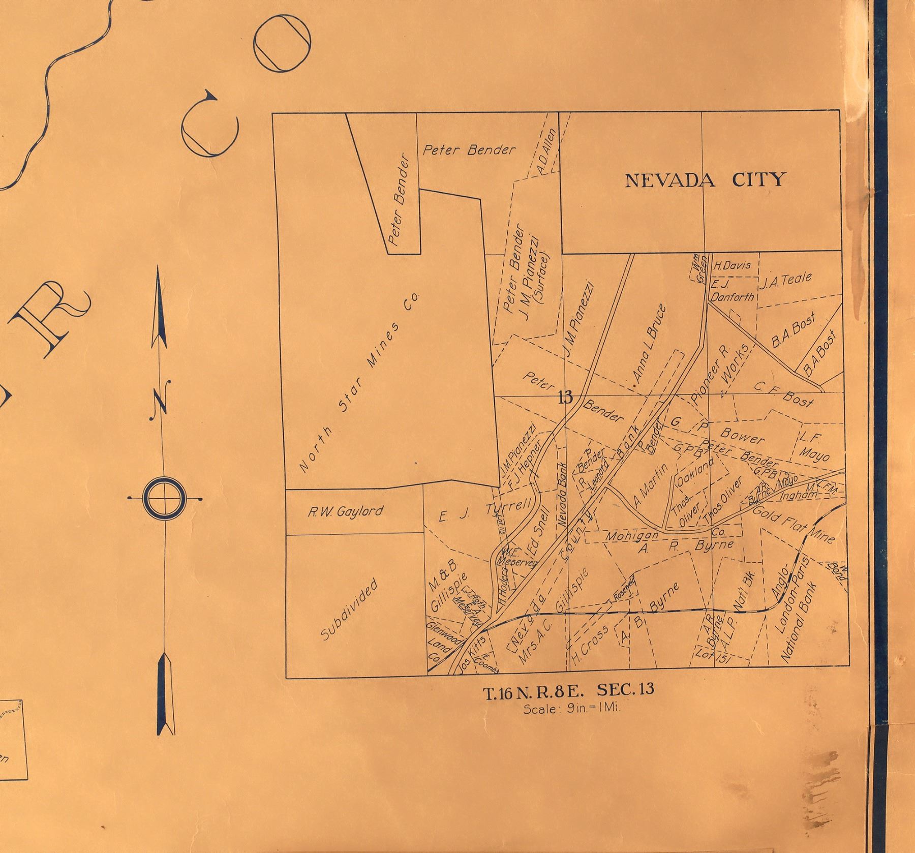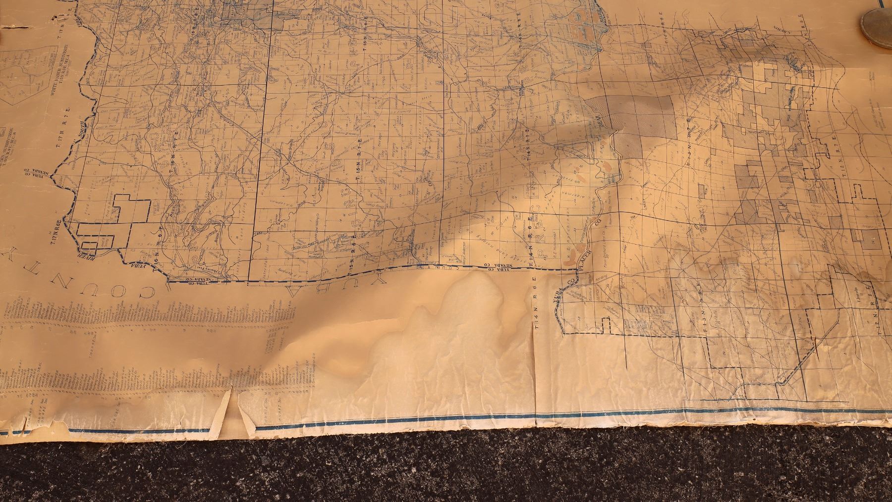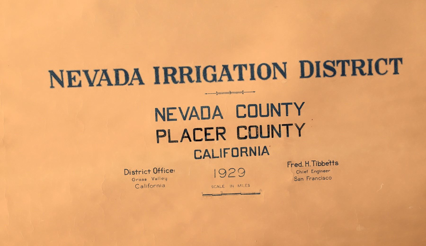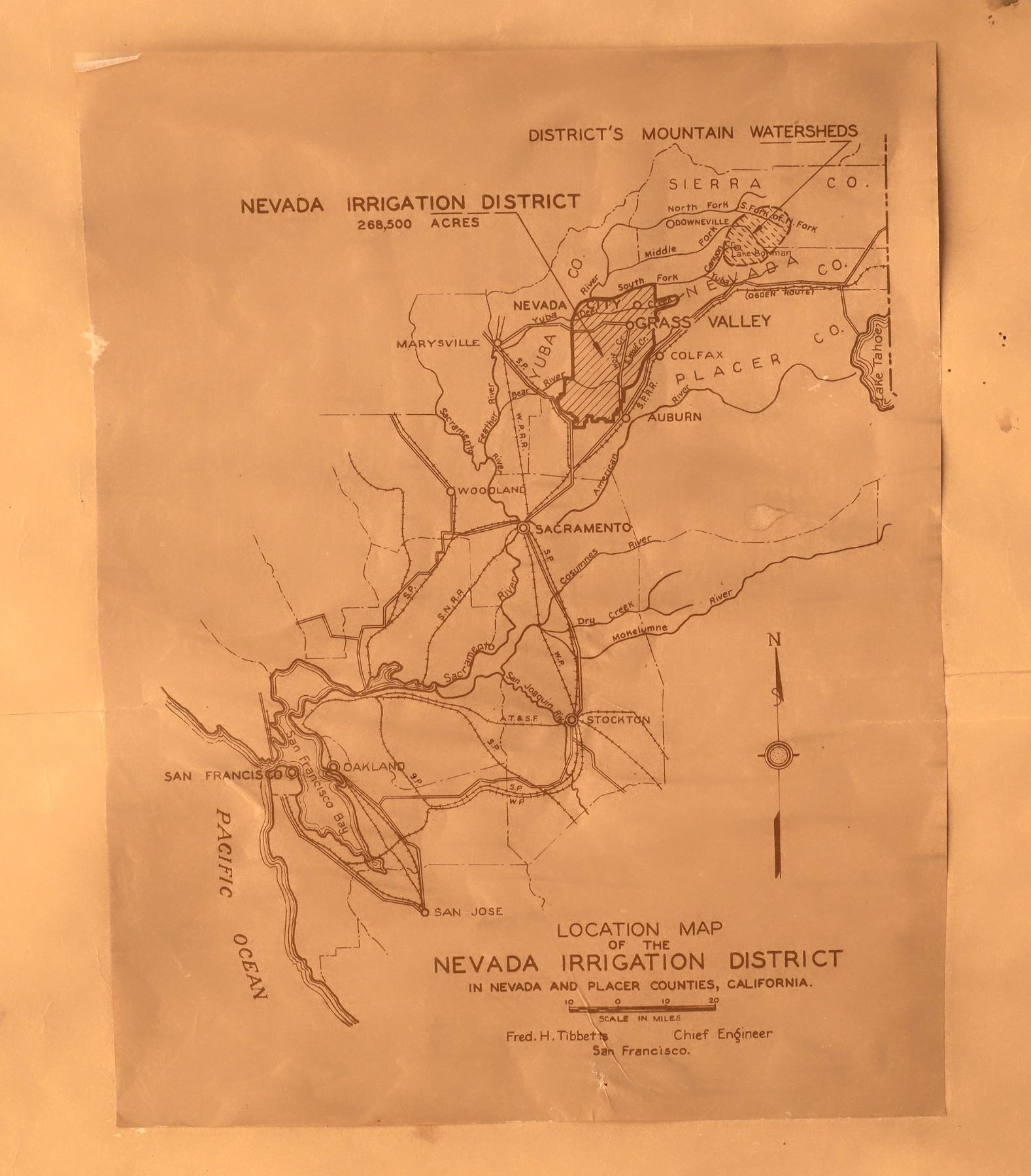 Canvas backed rollup map by Fred H Tibbetts, engineer, San Francisco, Grass Valley District office. Nevada Irrigation District. 1929. 1" to 5 mile scale. Rare. Water damage on left side. Tears along top. 66x74". Ex Don Schmitz collection.