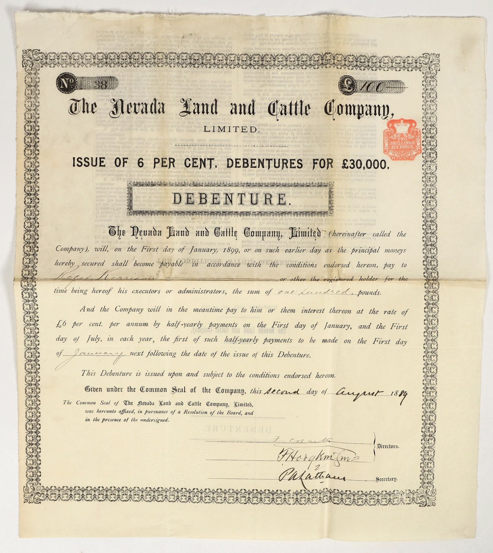 Rare. 100 pound bond with foreign imprinted revenue stamp. Signed by two directors and the secretary. 16 x 14" The huge 1,300,000-acre IL Ranch, mostly in Nevada, was acquired in 1883 by this British company. However, the disastrous heavy snowfall and temperatures during the winter of 1889-1890 caused the collapse of this company. The IL is still run today just as it was in the 19th century and is a true buckaroo outfit.
