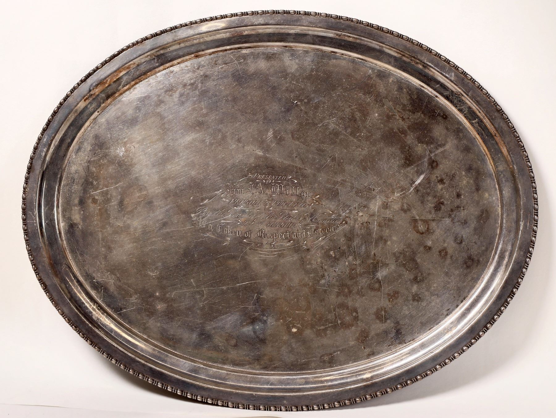 Wht. metal platter, 16x12". From 1905 22nd session of the Nevada Legislature. Inscription "Presented to Hon. J.A.Miller, President Pro-Tem, by the Secretary of State of Nevada, 22nd Session 'As a Token of Respect and Esteem'" Joseph A. Miller served in the Assemble as first a member of the Silver party from 1902-06 and then the Democratic party from 1910-14 representing Lander County. Under Gov. Sparks. Shows some wear scratches.