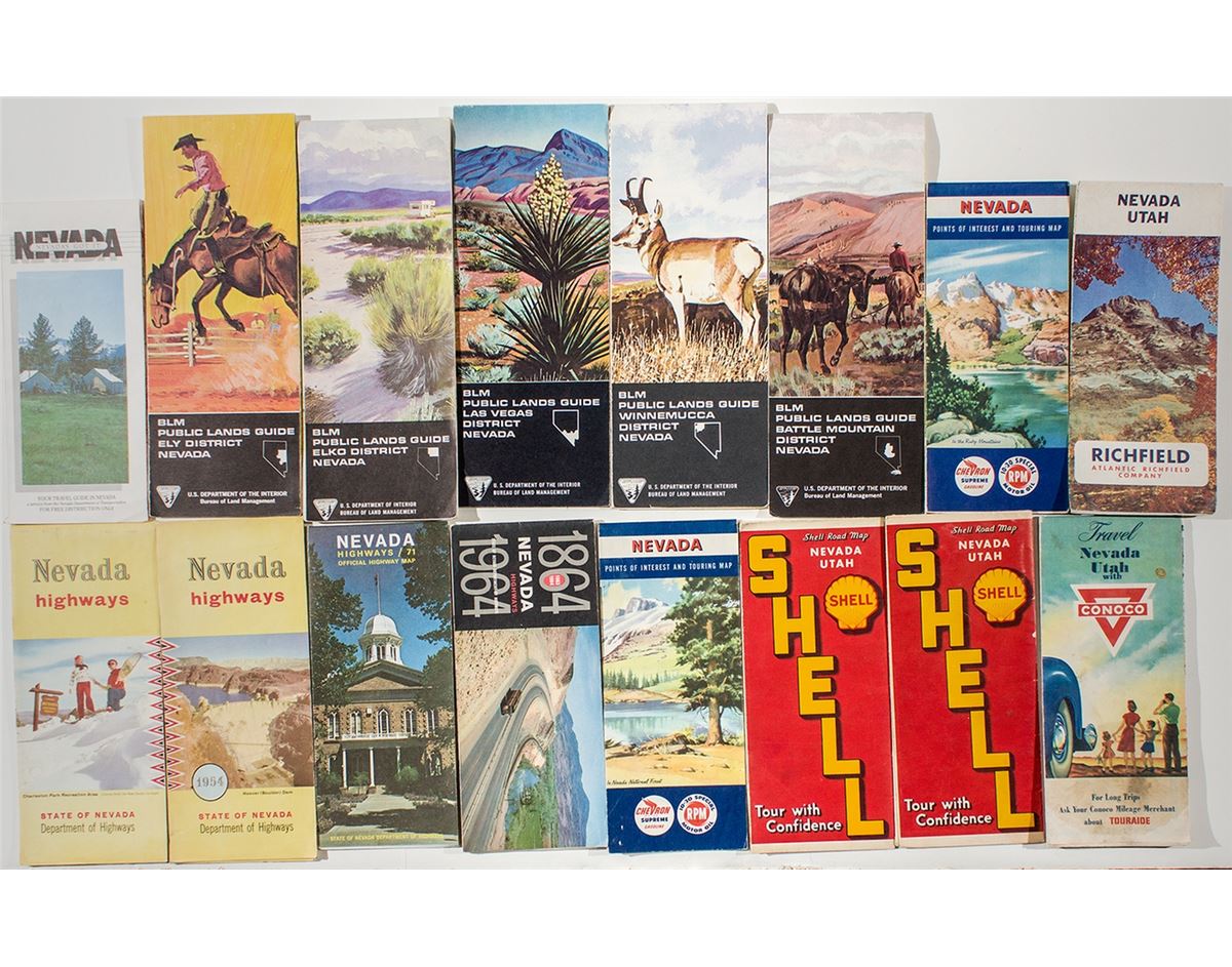 16 maps: five BLM maps of various districts, six oil company touring maps, Nevada Highways maps.