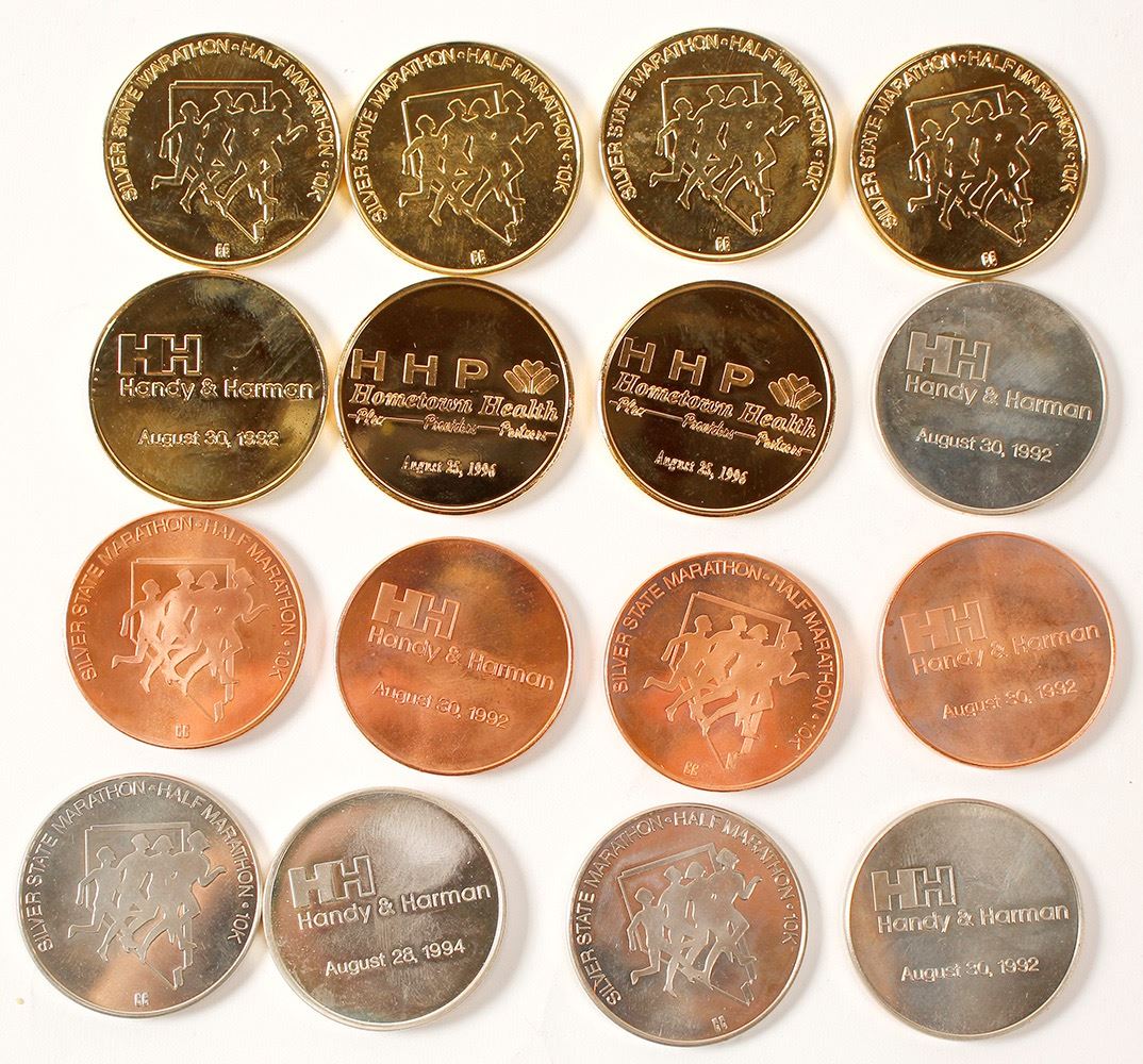 This lot contains 16 Nevada Marathon Medals from 1992. They are silver dollar size and were struck at the Carson City Mint. There are seven gold plated, five nickel and four copper. All are in near new condition. Date: 1992 Location: Carson City, Nevada HWAC# 571818