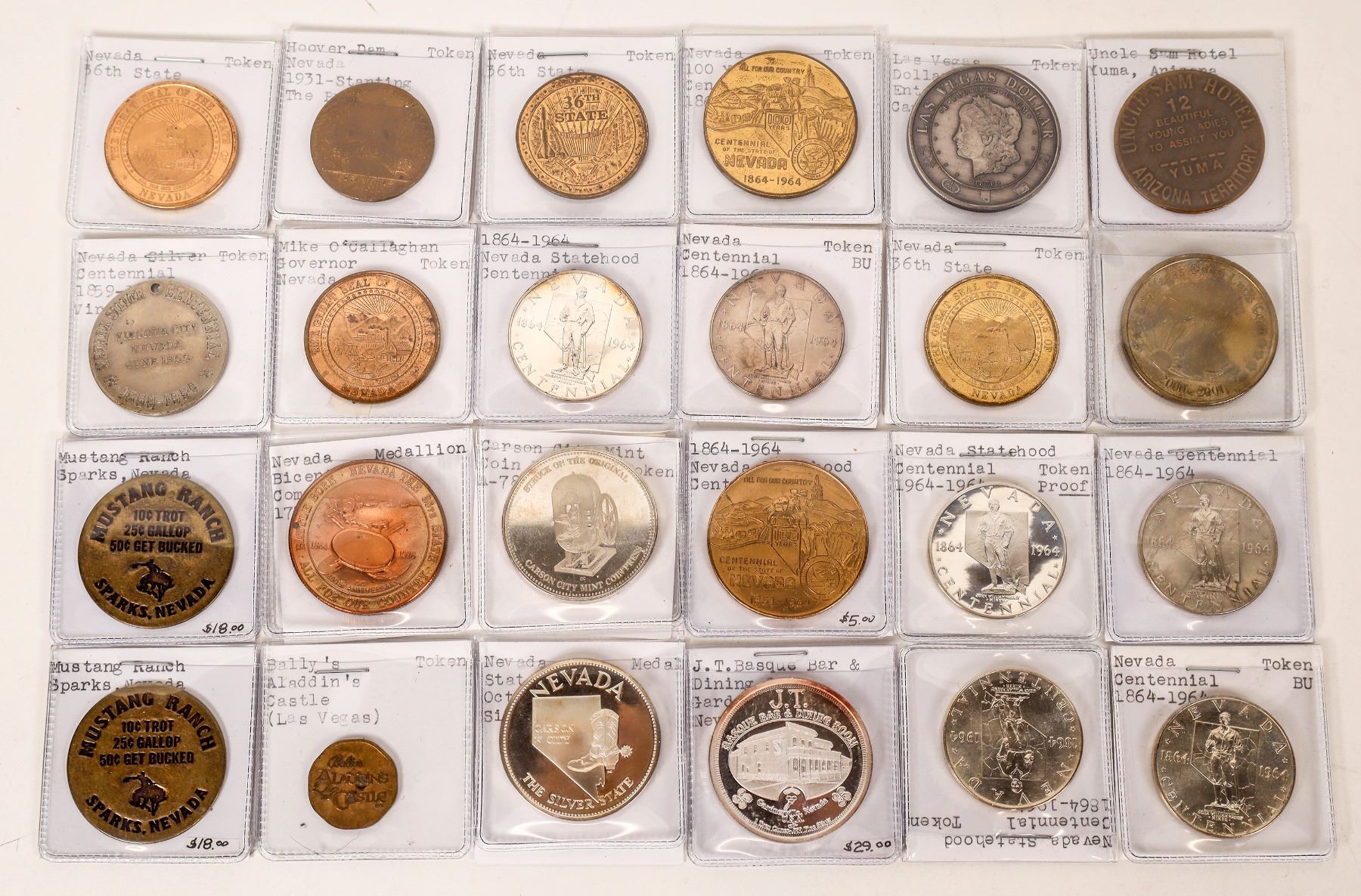 Lot of 22 Nevada medals: Mike O'Callaghan Governor; Nevada 36th State (3); 1931 starting the Hoover Dam; Mustang Ranch (2); 1959 Virginia City Centennial; 1964 Nevada Centennial (bronze)(2); 1976 Bicentennial; Las Vegas good luck dollars (2); Carson City Mint Coin Press; Nevada State Medal; J. T. Basque Bar & restaurant, Gardnerville; 1964 Nevada Statehood Centennial (silver)(6). Nevada