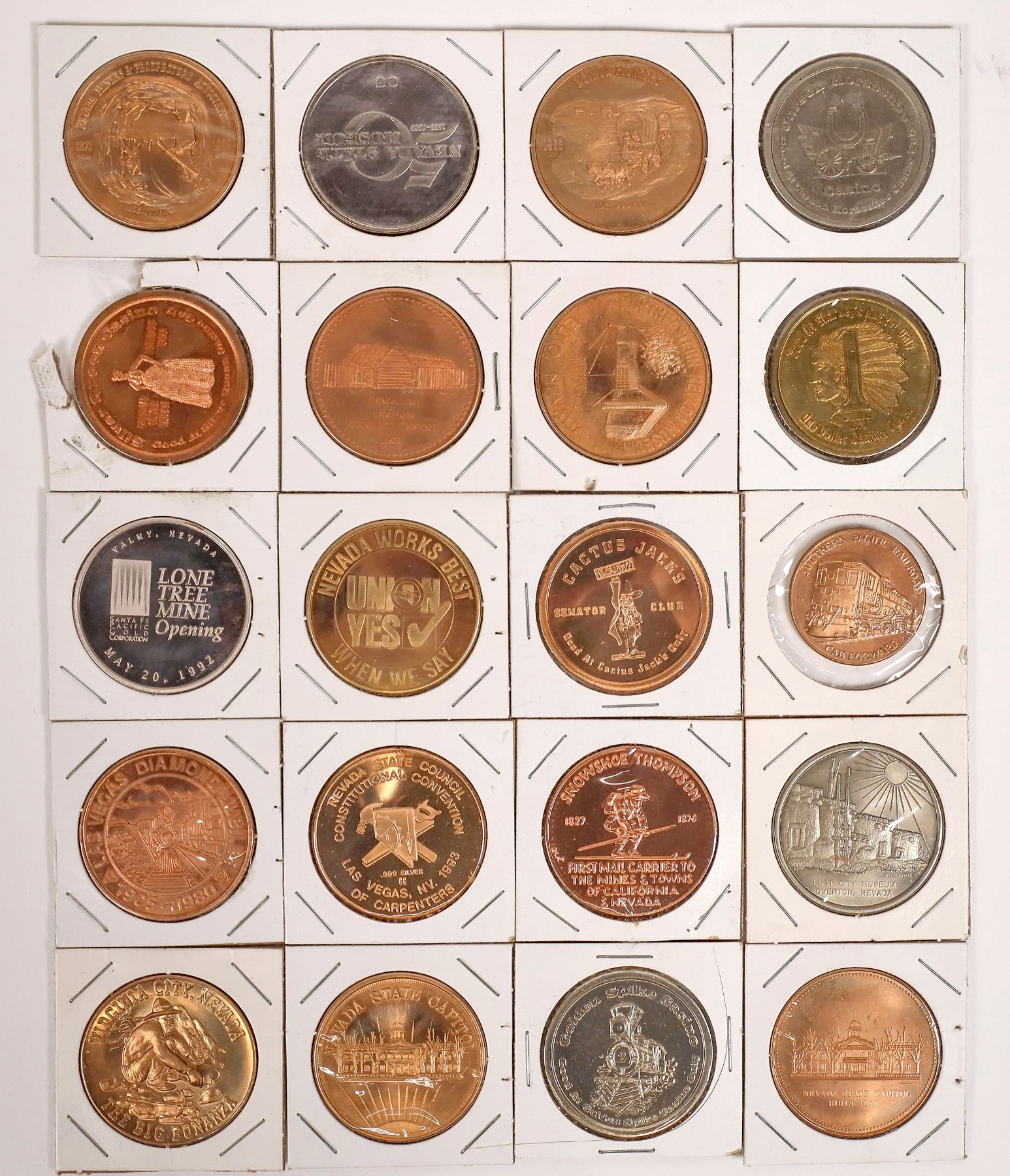 Between 1977 & 2001, Don Schmitz commuted over to Carson City from The Nevada City Mint to operate the coinage press for the Carson City Museum, formerly the U. S. Mint. Here are 20 medals he produced at the time. 50th anniversary Nevada State Museum; Golden Spike Casino Carson City gaming token; Snowshoe Thompson; 75th anniversary of the Las Vegas Review Journal; Nevada Works Best When We Say Union Yes; Sharkey's Casino Gardnerville; Northeastern Nevada Museum; Carson Horseshoe Casino; Nevada Miners and Prospectors Association; Nevada Pioneers; Lost City Museum Overton; Cactus Jack's Carson City; Lone Tree Mine Opening 1992; Silver Queen Casino, Virginia City.