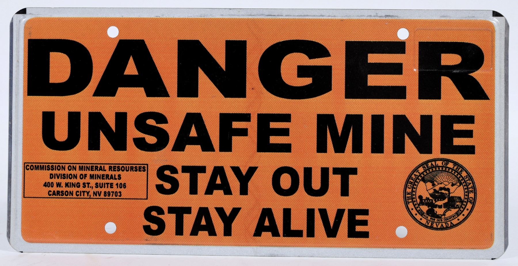 Very rare Danger/Unsafe Mine/Stay Out/Stay Alive license plate size metal sign. They were only used for a short time. 6x12.25".