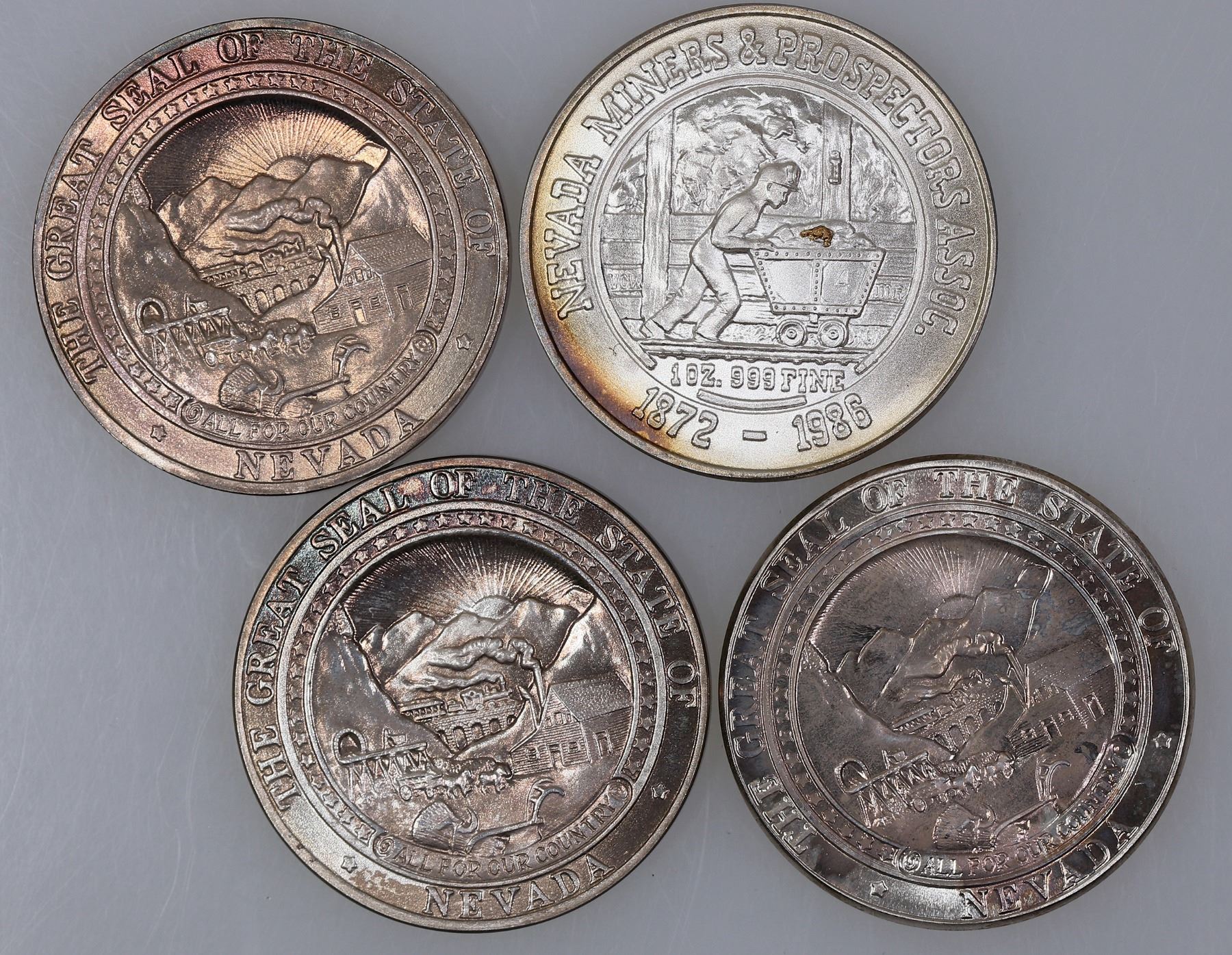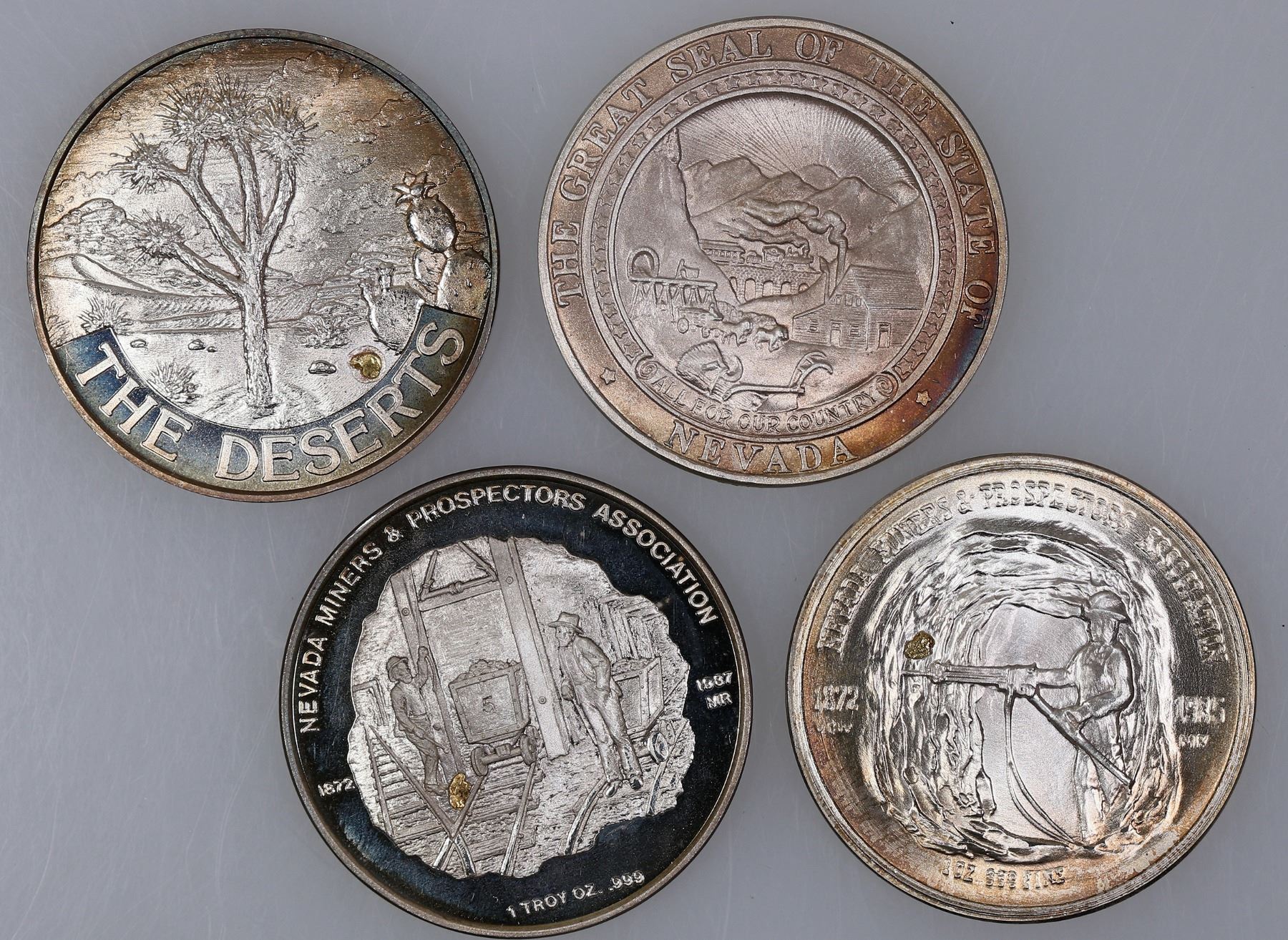 Lot of four one ounce silver rounds made by the Nevada Miners and Prospectors Association. 1985, 1986 & 1987. The fourth is stamped "The Deserts" with no mention of the NMPA. All four have a tiny gold nugget, and the Nevada State Seal on the Reverse.