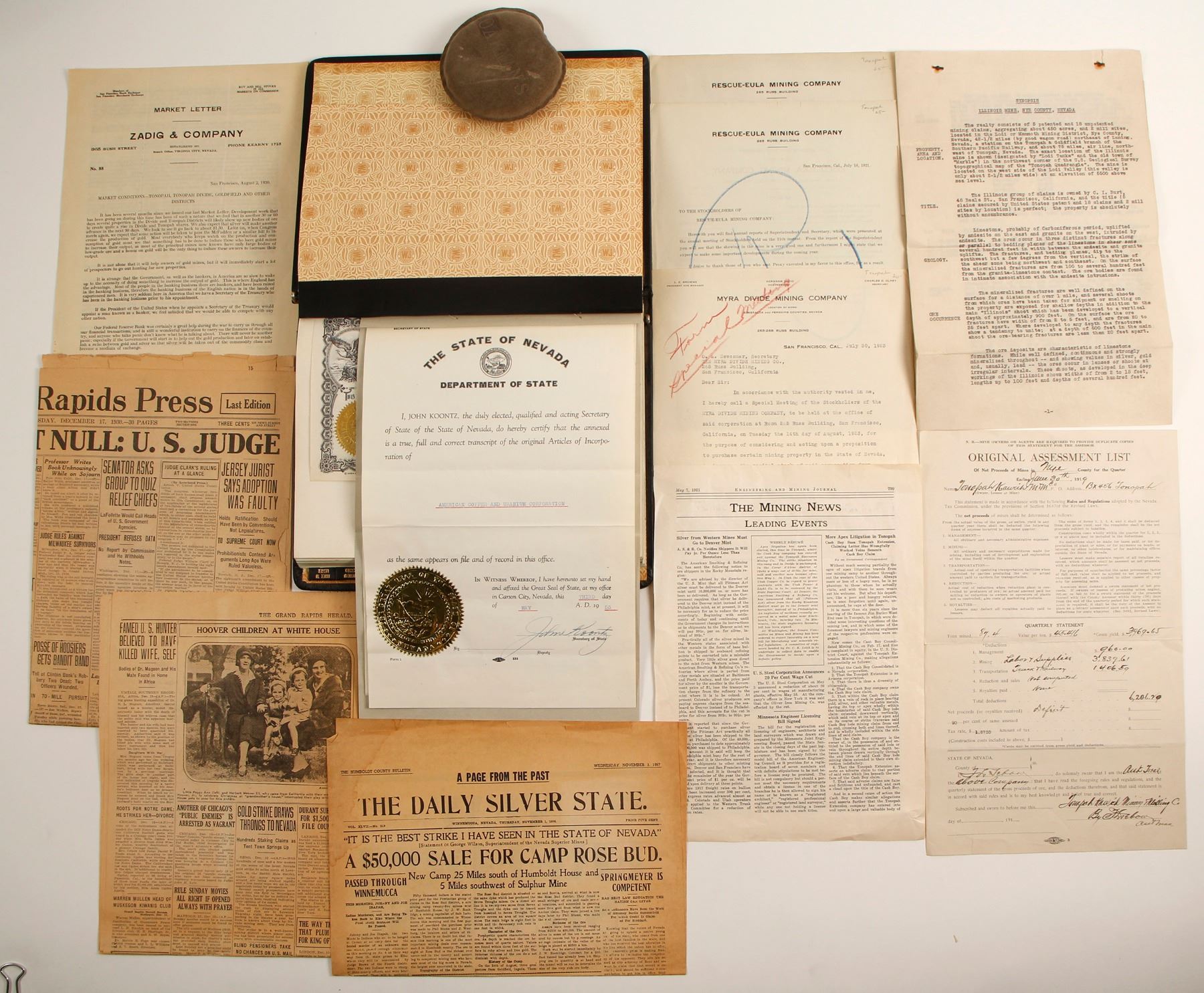 Hardcover American Copper and Uranium Corp ledger, 7 assorted papers