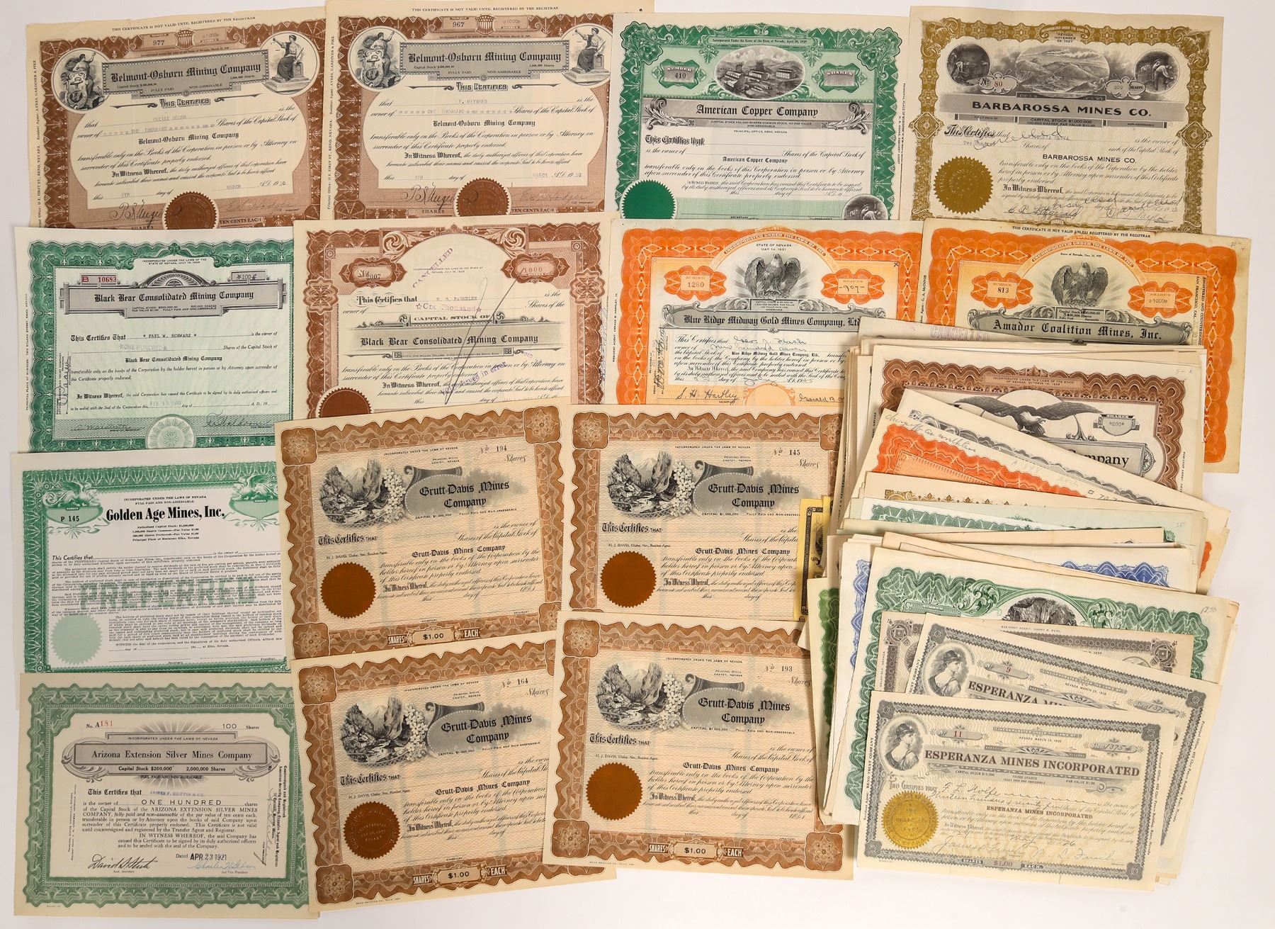 Lot of over 200 stock certificates from Nevada mining companies. Dozens of different companies, all 20th century. Belmont-Osborn; Goldfield Consolidated; Esperanza Mines; American Copper Company; Collar Gould & Savage; Comstock-Keystone and many more. State:Nevada City: Date: Provenance: Ken Prag Collection