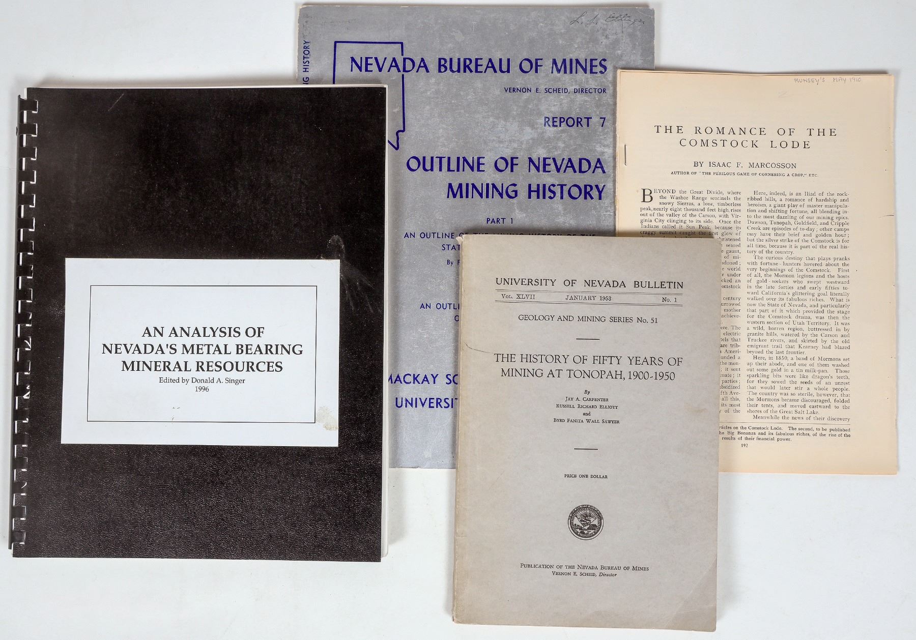 Publications of Nevada mining history (4) include The University of Nevada Geology & Mining Series #51, Outline of Mining History 1855-1923, An Analysis of Nevada's Metal-Bearing Mineral Resources and The Romance of the Comstock Lode. All are in nice condition. Please see photos for more details.