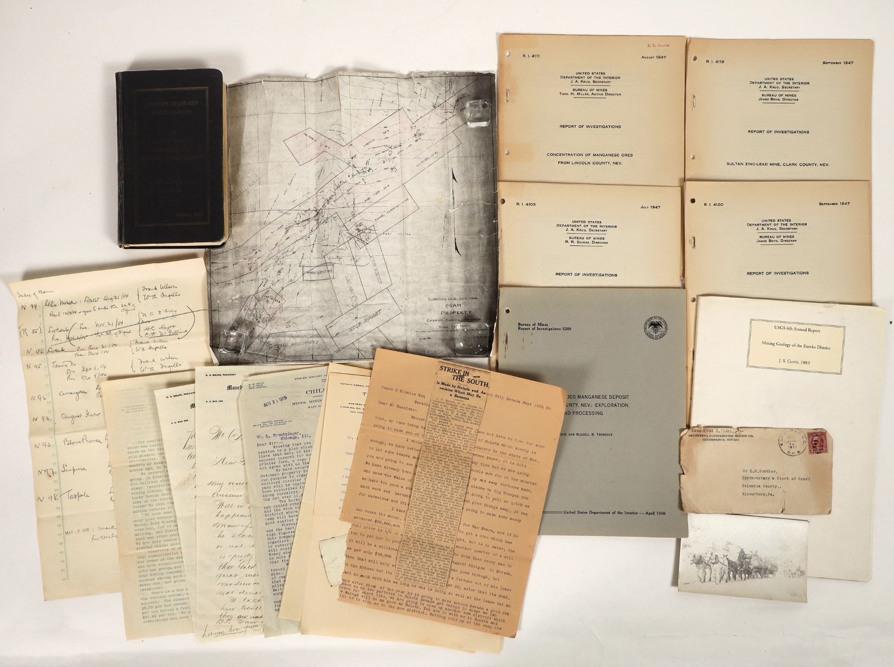 Lot of 20. Includes: 1956 report on Three Kids Manganese Deposit, Clark County; 1947 report of investigations of Sultan Zinc-Lead Mine, Clark County; 1947 report of investigations of Argenta Zinc-Lead Mine, Clark County; 1947 report of investigations of Rio Grande Copper Deposit, Elko County; 1947 report of Concentration of Manganese Ores, Lincoln County; USGS 4th Annual Abstract of a Report, Mining Geology of the Eureka District, JS Curtis, 1883; misc. mining stock broker correspondence incl. Manchester Cons. M&M Co., Reno (1908); Uniform Standard Specification for Public Works Construction. Clark County, 1966, and more. Please inspect.