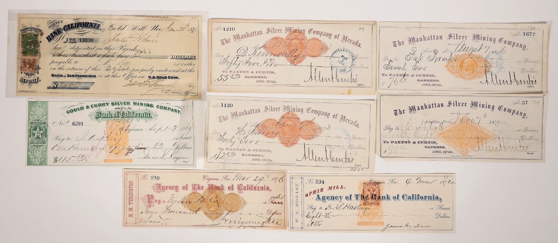 Collection of eight different checks, including very rare pieces. Best: Gould & Curry, 1869 with Green Nevada imprint and Fed B16; James Fair autographed Ophir Mill check with red Nevada imprint over B16a (books over $100), ; Yerington autograph on buff RND, unlisted. four different Manhattan SMC Fed imprints, and Bank of Cal, Gold Hill with Nev green 5c adhesive. nice group.