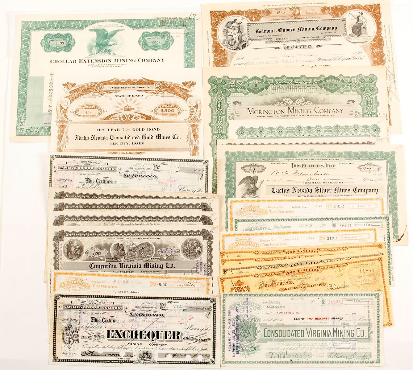 Lot of 22 stock certificates: Concordia Virginia Mining, Consolidated Virginia Mining Company, Ophir, Chollar Extension Mining Company and others. Most dated early 20th century. Date: Location: Nevada HWAC# 75115