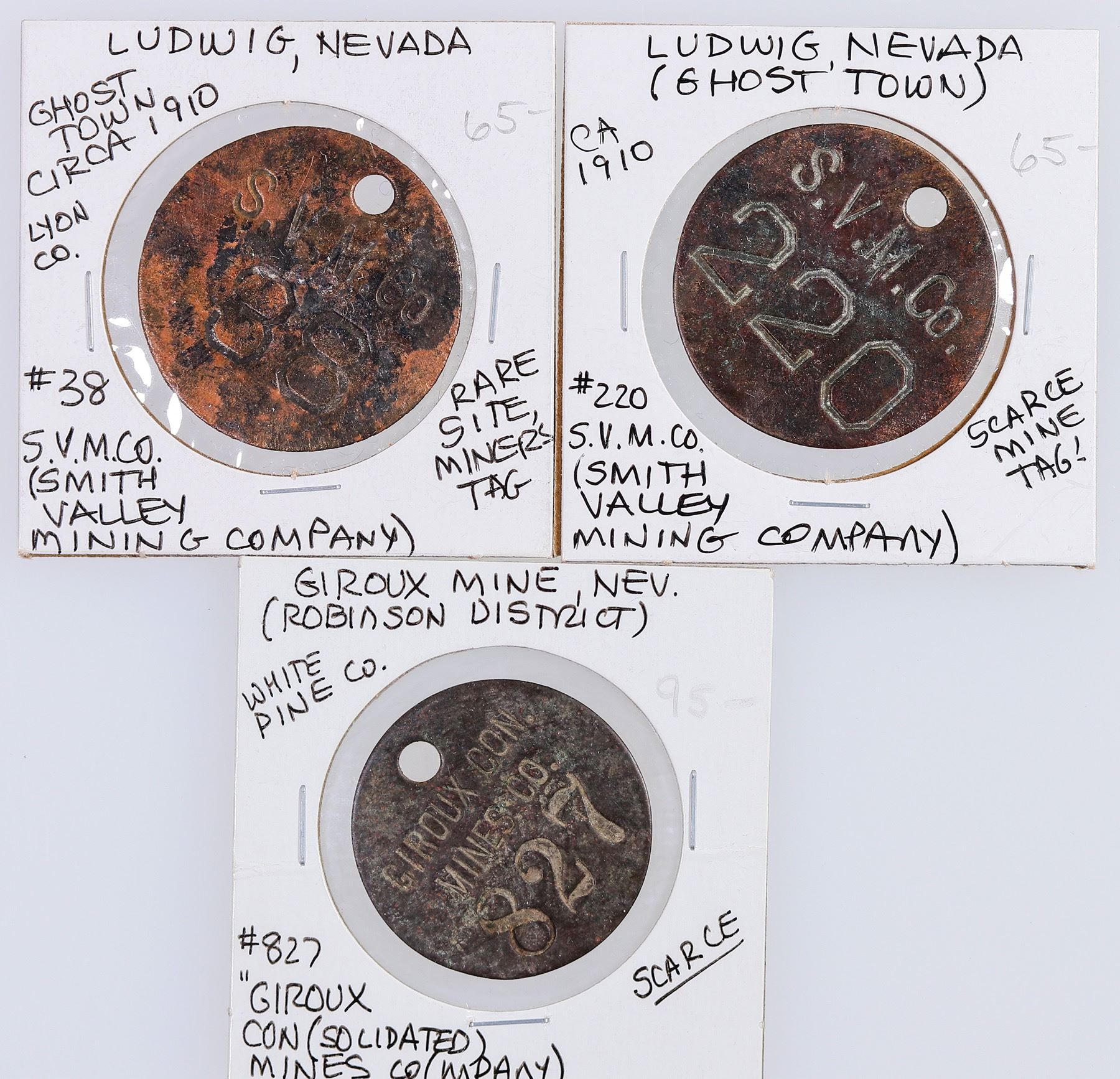 Three brass mining tags: Giroux Consolidated Mine, #827 (White Pine County); Smith Valley Mining Co. #220; Smith Valley Mining Co. #38.