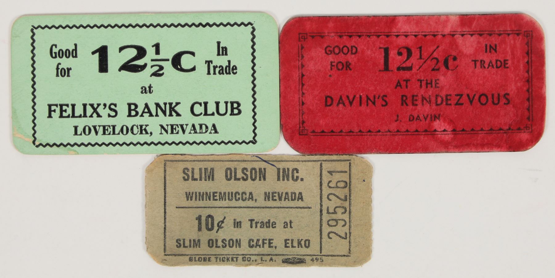Lot of 3 different. Includes: Davin's Rendezvous (Lovelock, GF 12.5c IT); Felix's Bank Club (Lovelock, GF 12.5c IT); and Slim Olson Cafe, Elko / Slim Olson Inc. (10c IT).