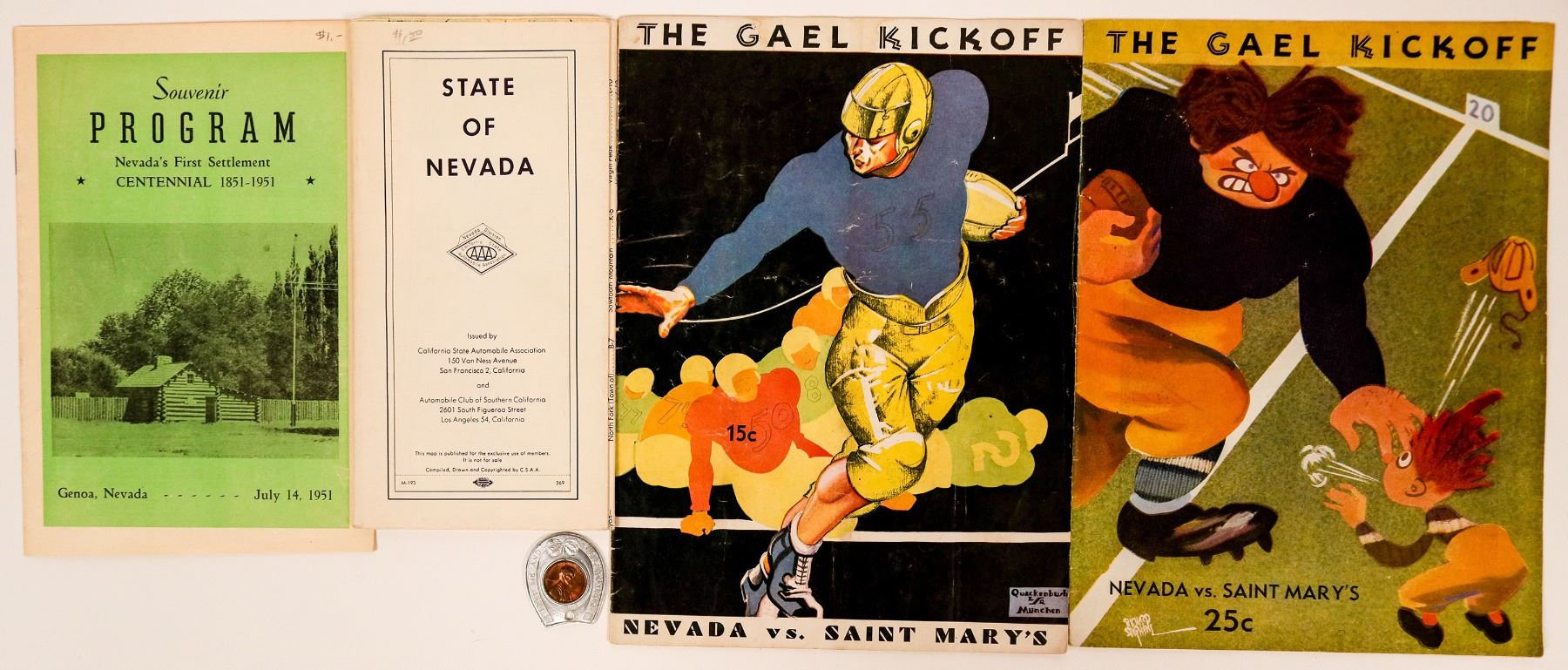 A small assortment of Nevada paper items, including to programs from UNR football, a AAA map and a Nevada Centennial booklet.