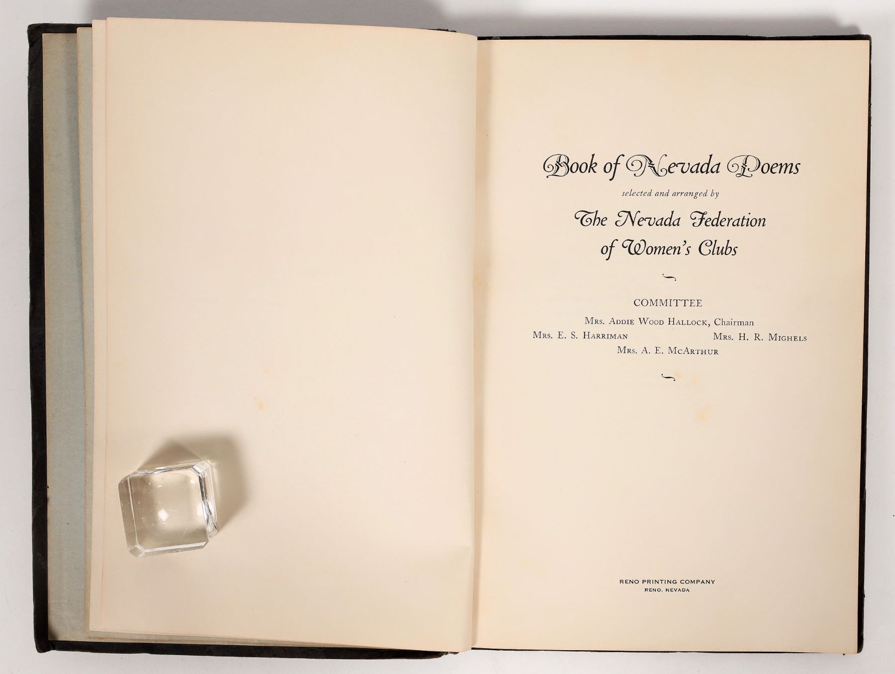 A 1927 book of poetry about Nevada by local poets, published by the Nevada Federation of Women's Clubs and printed by the Reno Printing Company. Hardback, 214 pages. Generally good condition, some wear around edges of cover/spine, toning consistent with age. A unique and charming piece of local history.