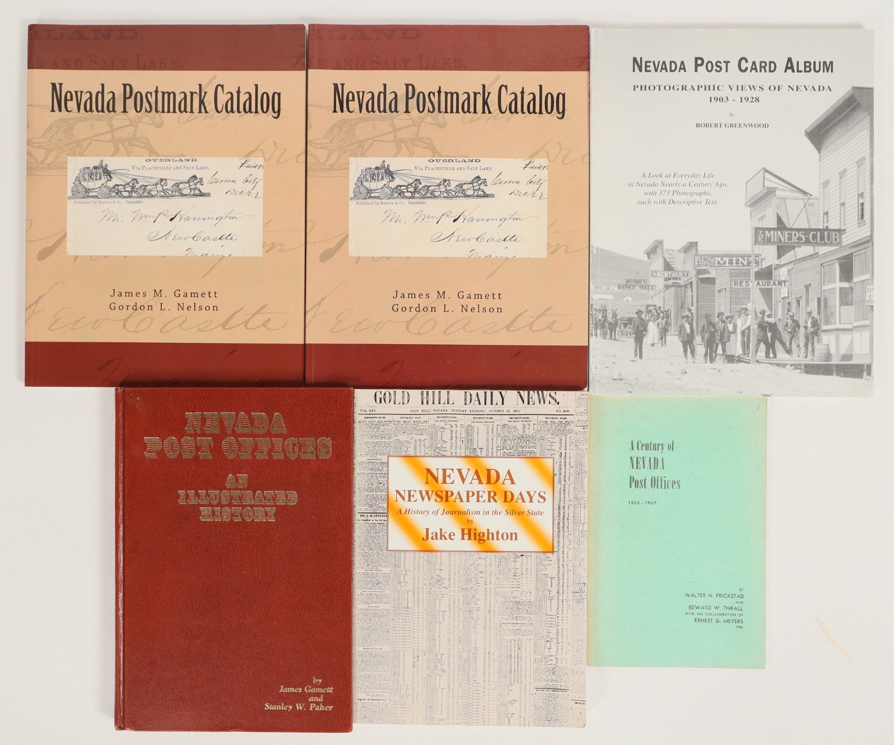 Group of 6 books on the history of post offices in Nevada, published between 1958 and 2018. All in good condition; see photos. Includes 2 copies of "Nevada Postmark Catalog" by Gamett and Nelson.