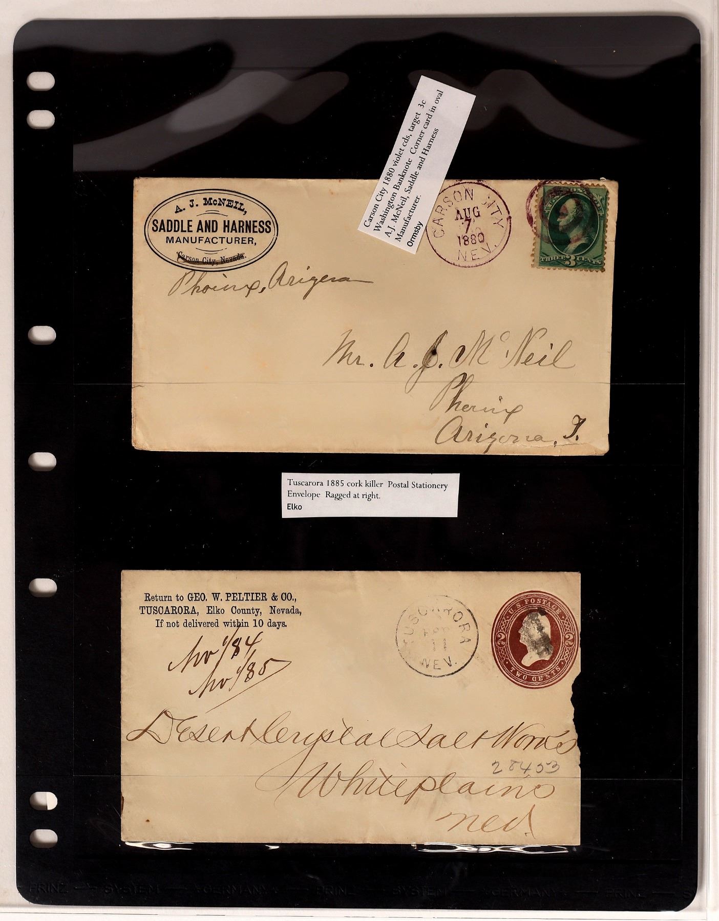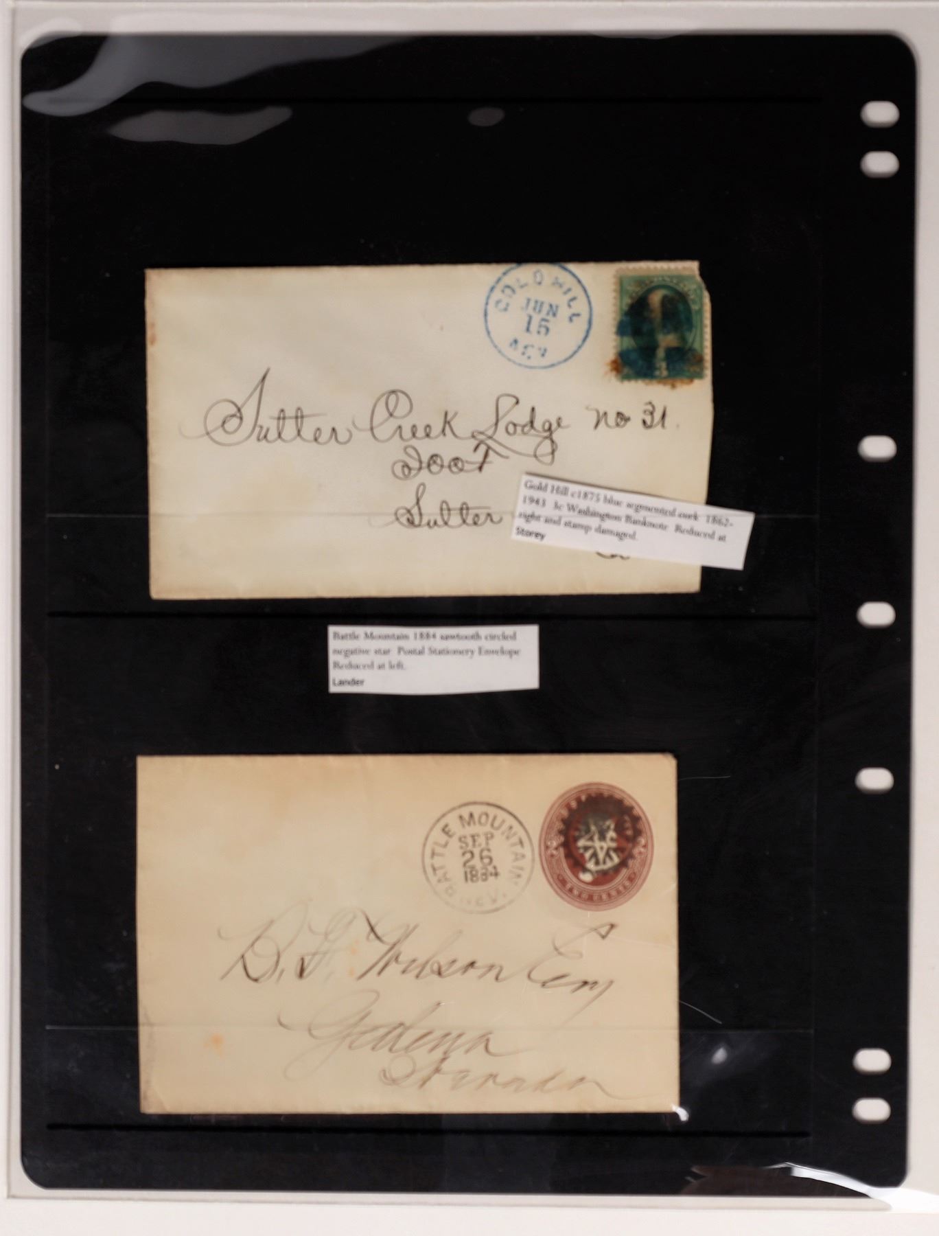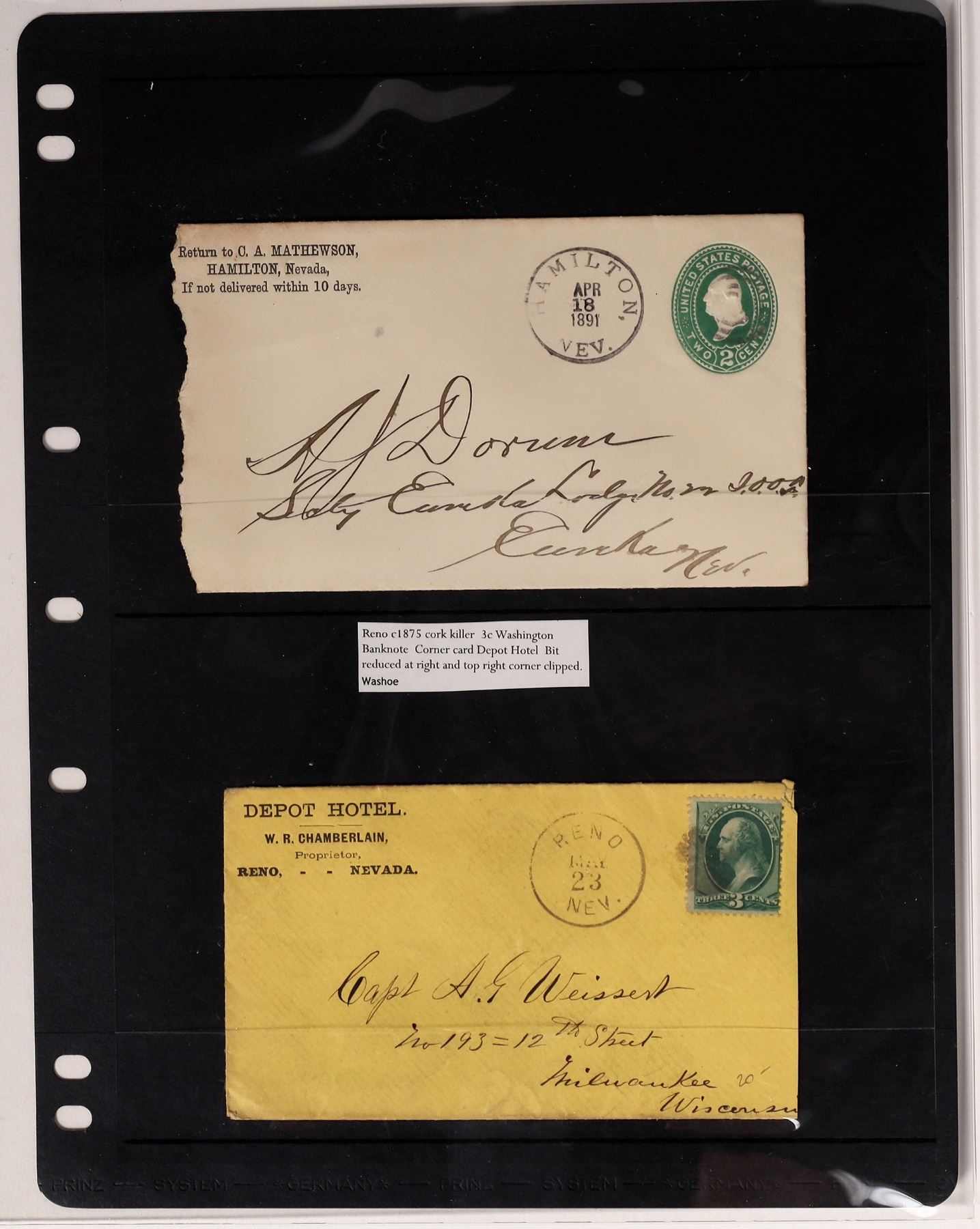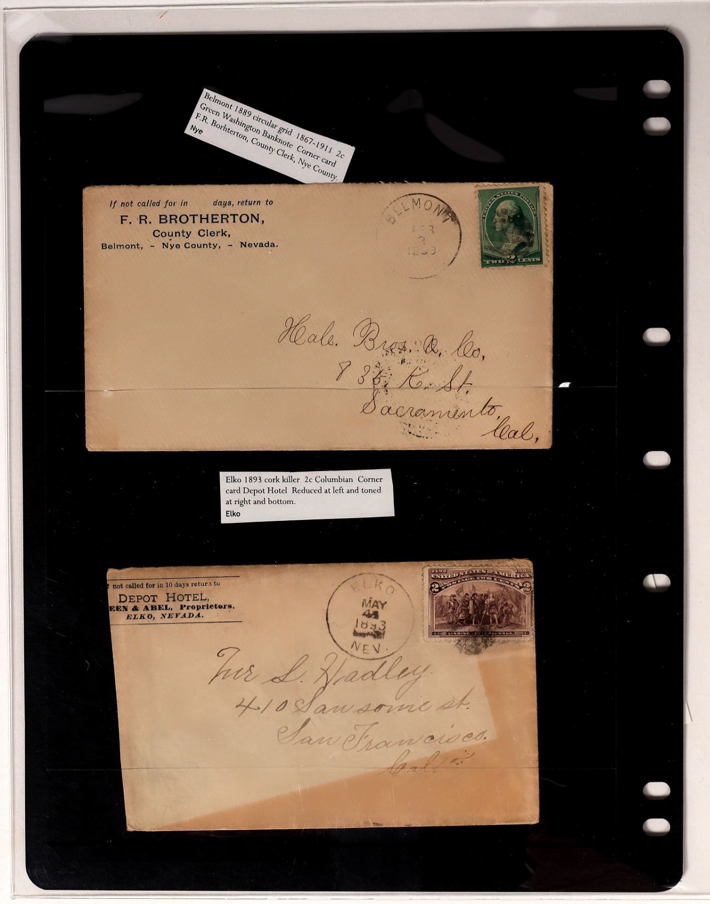 Total of 12. Includes many corner covers. 1) Depot Hotel, Green & Abel, 1893. 2c Landing of Columbus stamp. With two page letter: "Mr. Young has taken my wagon, horses and everything away from meÖ". 2) Hamilton Wells Fargo cover. Torn roughly at right but Hamilton is strong! 3) Peltier, Tuscarora 1885 with cork killer. 4) McNeil Saddle and Harness Manufacturer, Carson City. 1880. 5) Mathewson, Hamilton, 1891, Strong strike. 6) Brotherton, County Clerk, Belmont. 1889. 7) Depot Hotel, Chamberlain, Reno. c1875. Non-corner covers include Gold Hill c1875, Battle Mountain 1884, two Austin (one c1865), Wadsworth c1887,