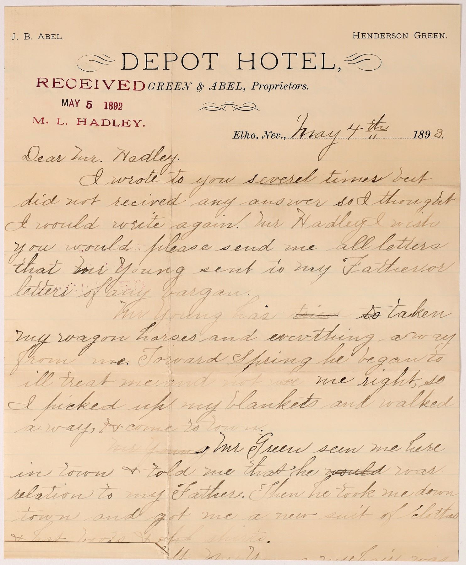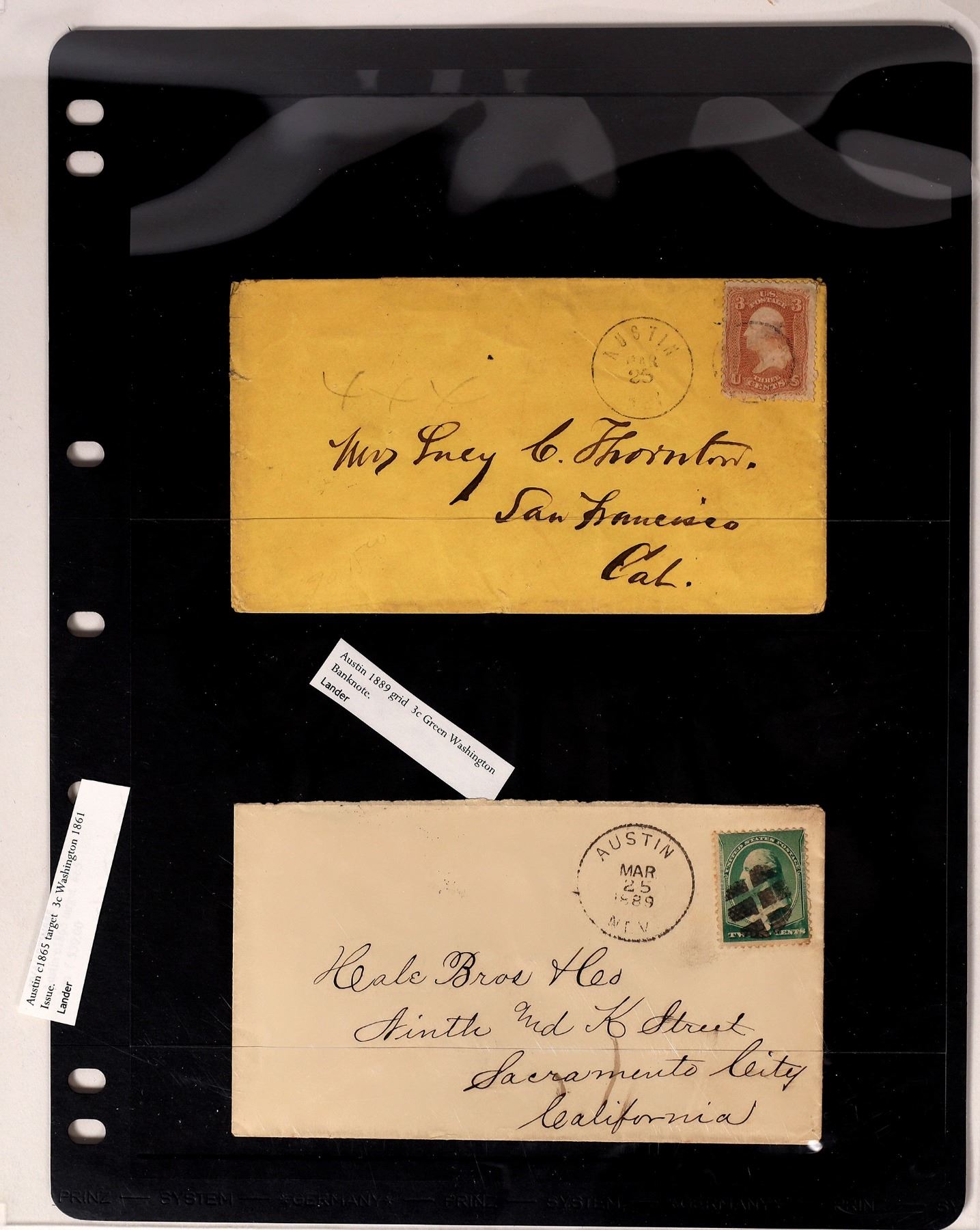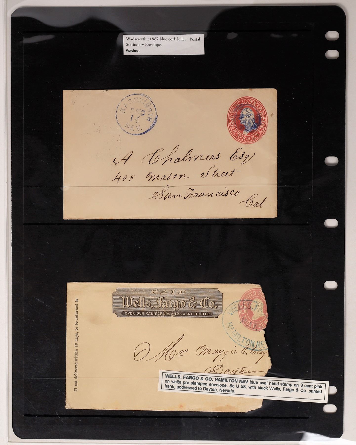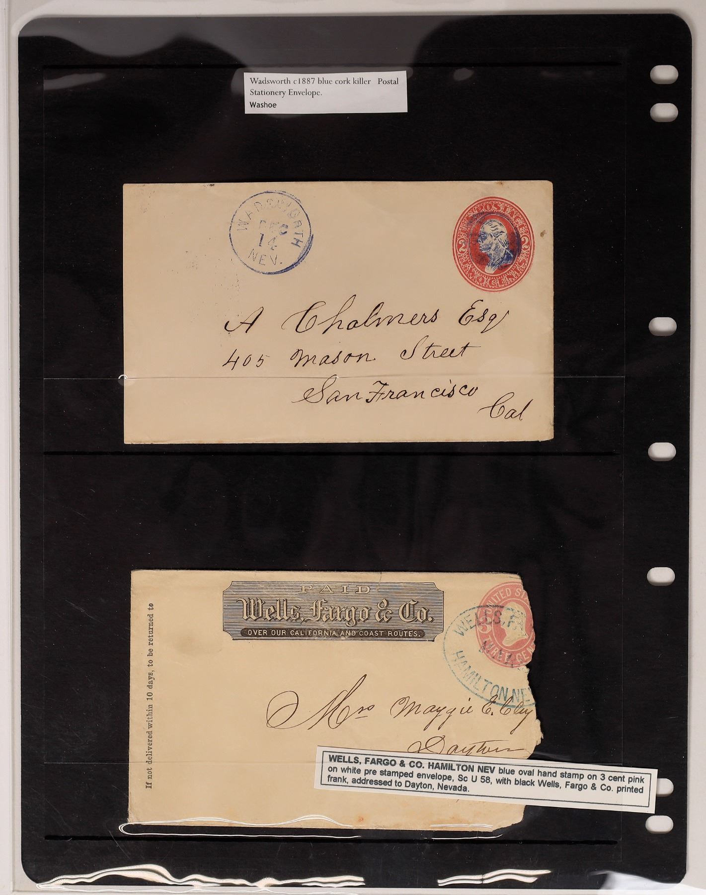 Total of 12. Includes many corner covers. 1) Depot Hotel, Green & Abel, 1893. 2c Landing of Columbus stamp. With two page letter: "Mr. Young has taken my wagon, horses and everything away from meÖ". 2) Hamilton Wells Fargo cover. Torn roughly at right but Hamilton is strong! 3) Peltier, Tuscarora 1885 with cork killer. 4) McNeil Saddle and Harness Manufacturer, Carson City. 1880. 5) Mathewson, Hamilton, 1891, Strong strike. 6) Brotherton, County Clerk, Belmont. 1889. 7) Depot Hotel, Chamberlain, Reno. c1875. Non-corner covers include Gold Hill c1875, Battle Mountain 1884, two Austin (one c1865), Wadsworth c1887,