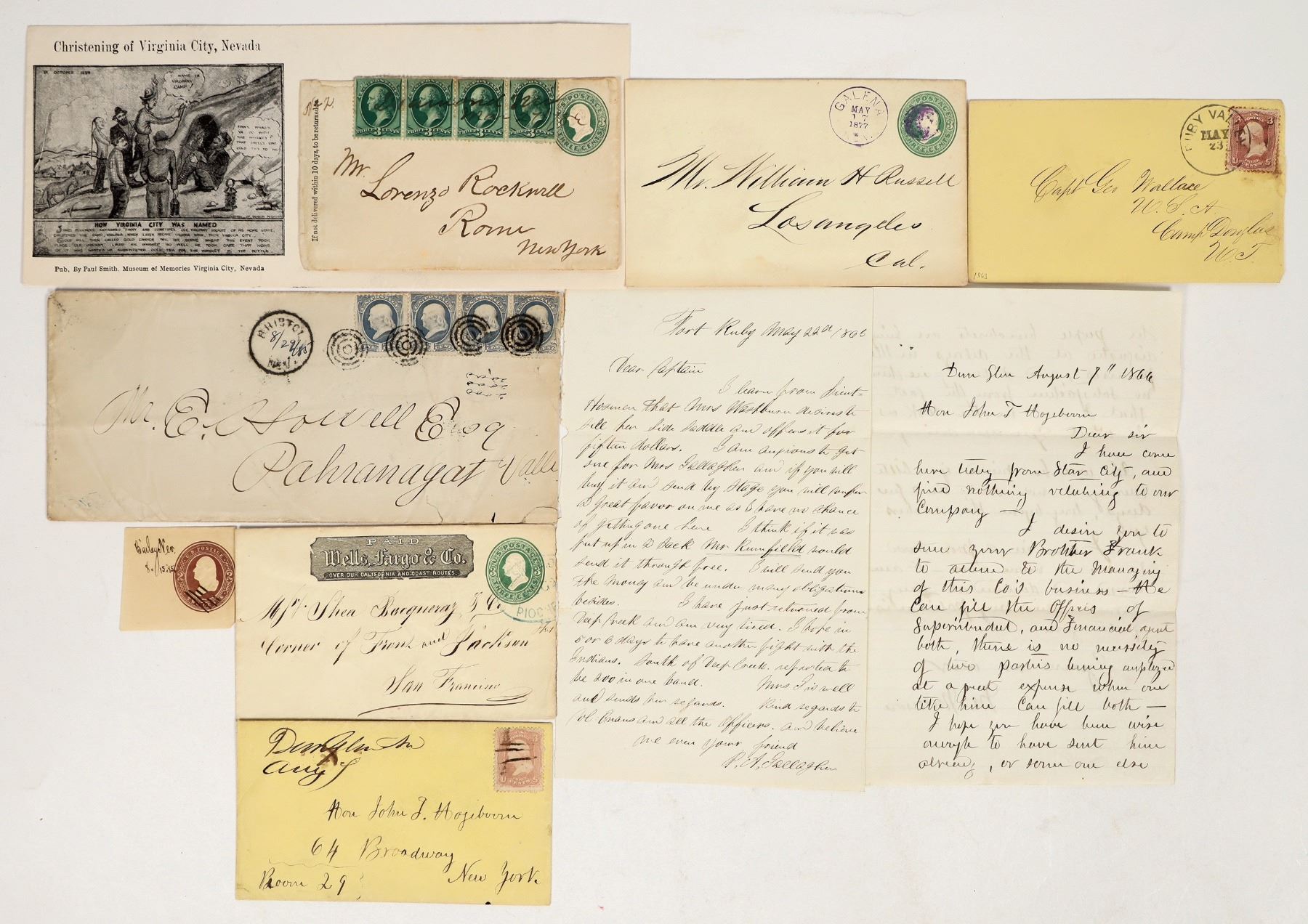 Lot of 8. Printed stories are included for each cover. 1. One cut square Lander Bailey , there are only 3-5 known and all are cut squares. 2. Cover Pioche, NV. Wells Fargo & Co. PAID 3. Christening of Virginia City , NV. cover w/printed pic/story on front of how the city was named. Unused..VG cond. 4. Bristol Lincoln, NV. 1885 postmark w/4 cancelled 1c stamps. 5. Diamond NV manuscript 1878. Four 3c stamps and one imprinted. 6. Ruby Valley, NV. 1865 postmark, 3c stamp. Letter from Fort Ruby from Major P.A. Gallagher to Capt. Wallace. 7. Dun Glenn, manuscript 1866, 3c stamp. Letter included. 8. Galena NV. 1877 postmark, 3c imprinted stamp. Excellent cond.