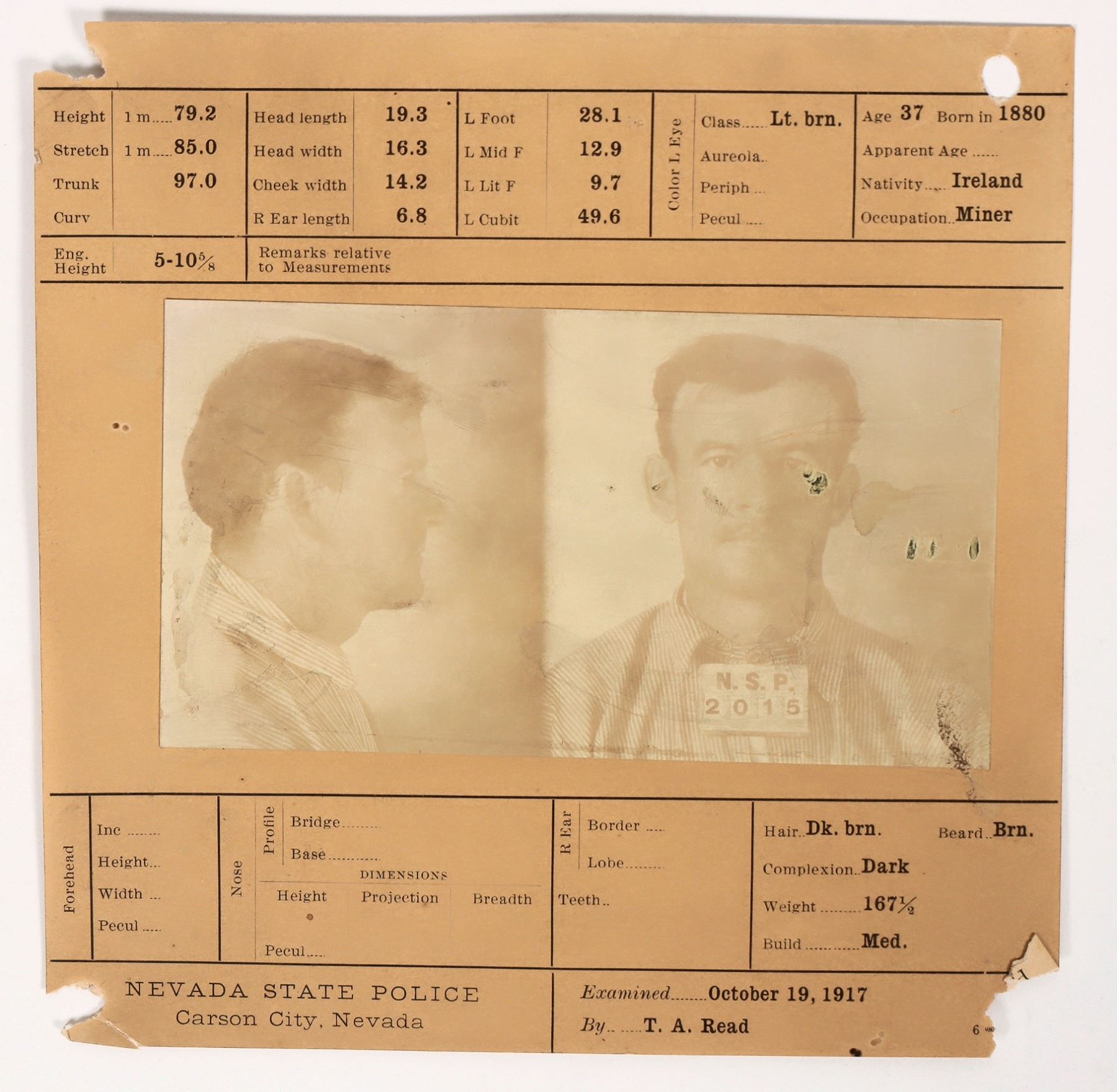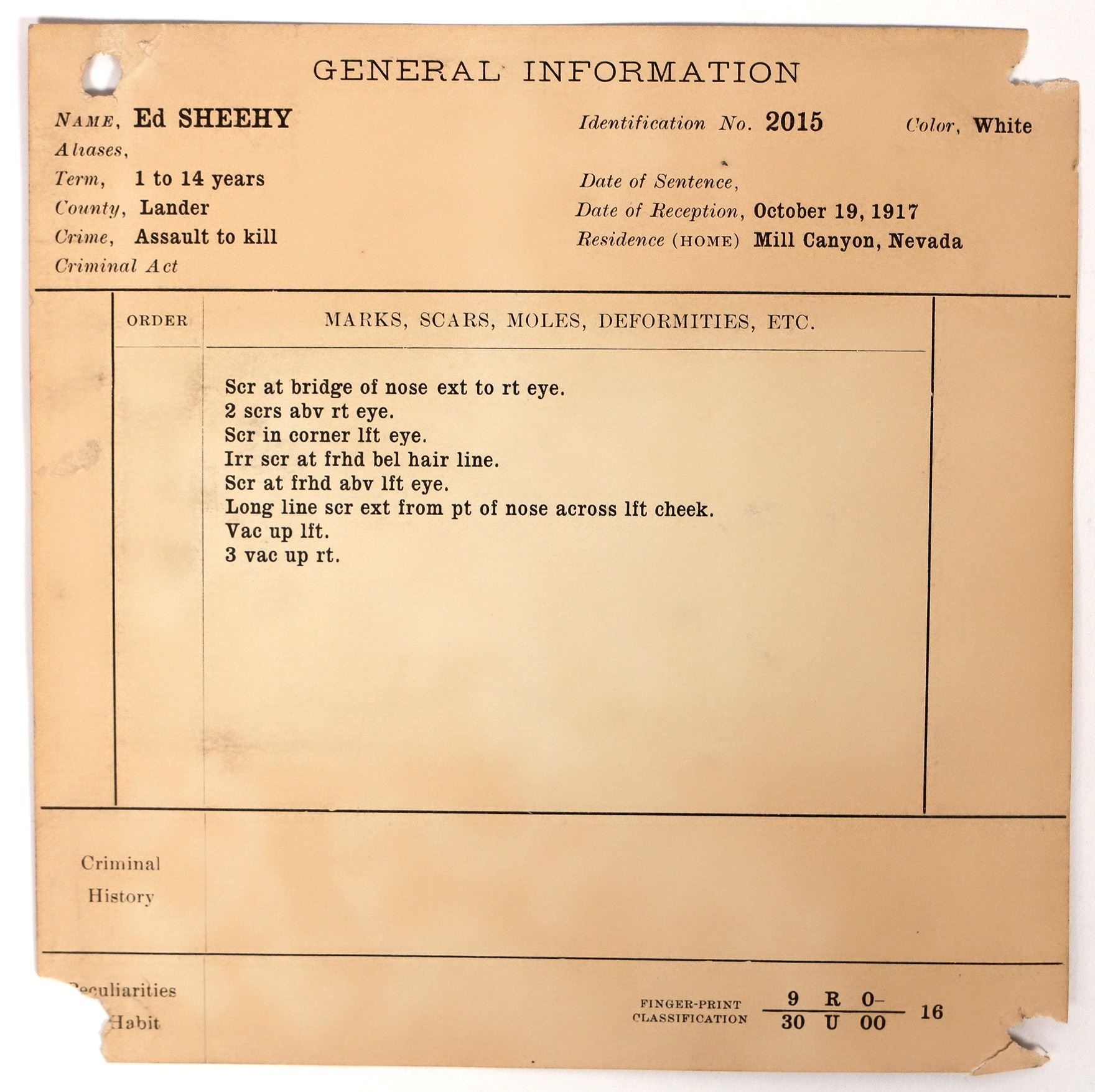 Rare 1917 Nevada prisoner record and photo from Nevada State Police. Ed Sheehy was a miner from Ireland, born in 1880. Numerous facial scars noted.