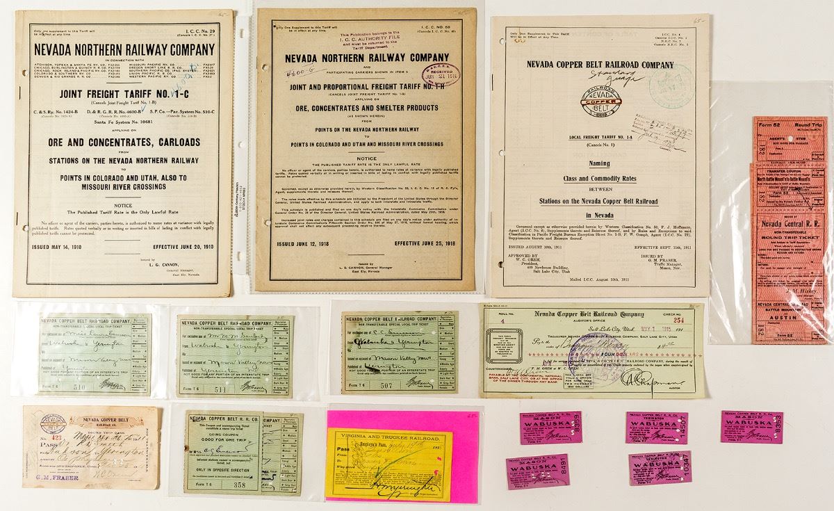 Lot of 16. Many different Nevada railroads: Virginia & Truckee, Nevada Copper Belt, Nevada Central, and Nevada Northern. 1) Nevada Copper Belt Railroad. Five cardboard tickets (1913-16). Five other tickets incl. 1911 Round Trip pass (Mason, Nevada). Also, a 1915 check from the auditor's office. Also, a 1911 booklet of rates on the railroad. 2) Virginia & Truckee Railroad employee pass from 1878 (Yerington stamp signature). 3) unused Nevada Central RR round trip ticket from Battle Mountain to Austin. 4) Nevada Northern Railway Company. Two booklets (1910 and 1918) discussing rates for transport of Ore and Concentrates from stations on the Nevada Northern Railway to points in Colorado and Utah. Rare! (Prag Collection) City: State: Nevada Date: ID# 34962