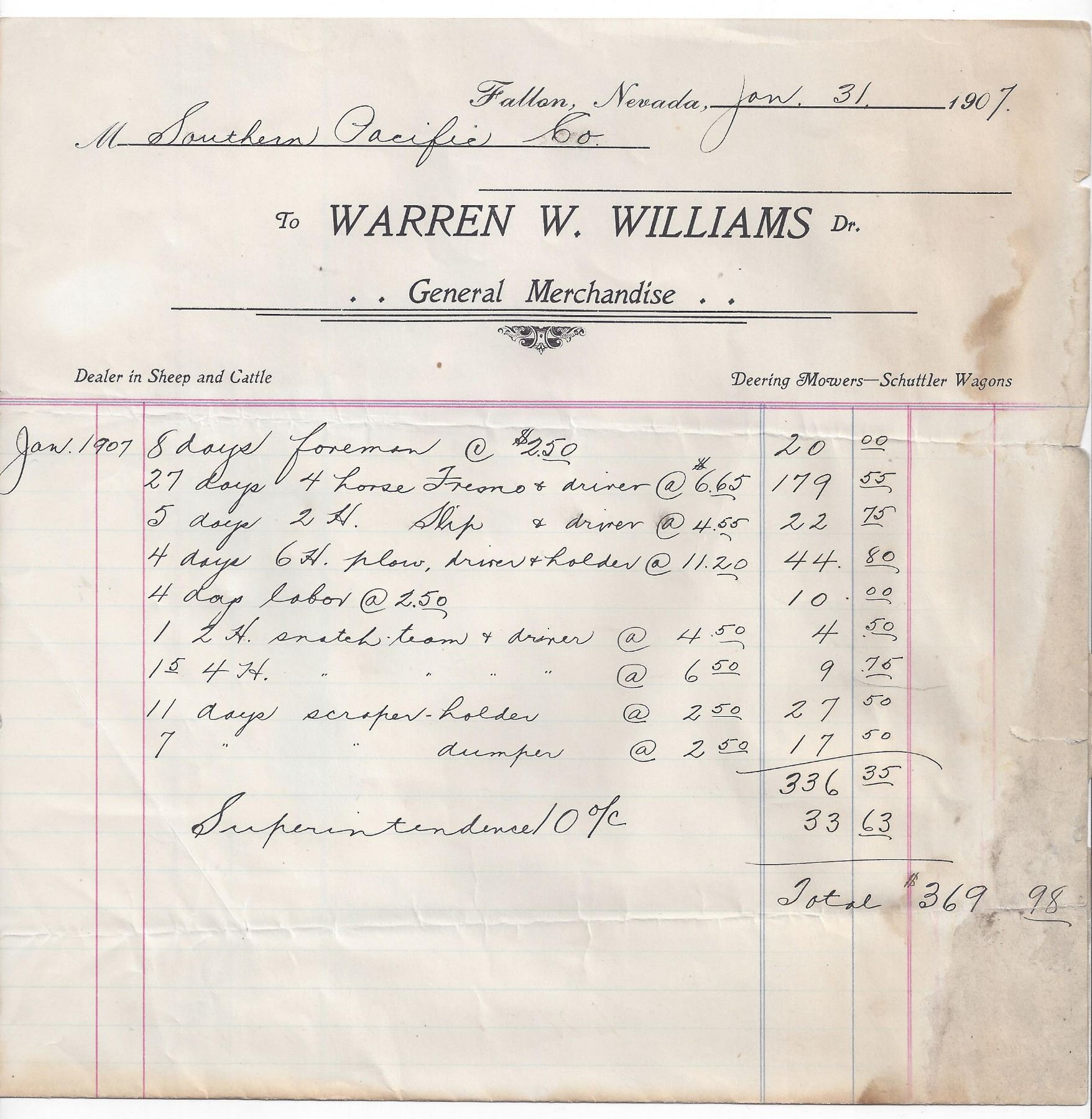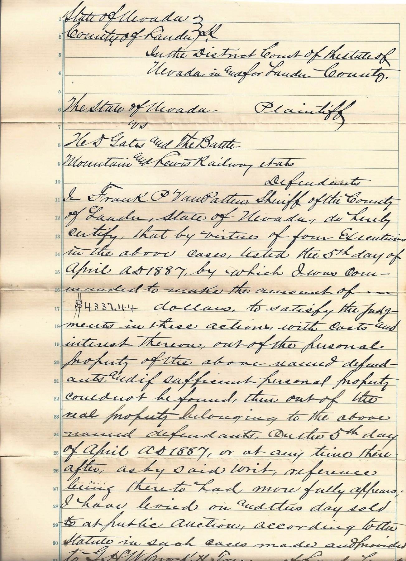 1) Death Knell for the Battle Mountain & Lewis Railroad: 1887 official document providing for the sale of the Battle Mountain & Lewis RR by the Lander County sheriff for back taxes for this very short line even by Nevada short line standards. 2) Warren Williams and the Southern Pacific. Williams was key to getting the spur track to Fallon as shown by this bill to the SP. 3) Early 1871 Central Pacific Expense Bill and Palisade Fast Freight Billhead: Lot of two: November 18, 1871 CPRR bill for mining equipment to [and here is where it gets interesting] Mr. 'A' [inside a curved box], over 'P'. Also a Palisade Fast Freight Line billhead. Dated November 20, 1871 - two days after the CPRR bill. Addressed to 'A' [inside a curved box]. Geo. Atwood, Eberhardt. 4) Nevada vs CPRR: In 1859 the Central Pacific Railroad changed the face of Nevada forever. The state of Nevada and the United States of America had given this railroad a great deal of importance and power to build the line. This made men a few men very powerful and, I might add, very, very rich. In the 1870’s Nevada took an economic turn for the worse. But the railroad kept on showing unbelievable profits each month. The people of Nevada and the local governments decided it was time that the railroad pay their fair share! This is an official notice to the Central Pacific Railroad from the County of Lander for the taxes owed as posted by Sheriff B. C. Thomas. Also a newspaper delinquent tax notice that was posted from April 5, 1880 to May 1st. Historical background information included! State: City: Date: HWAC# 99480