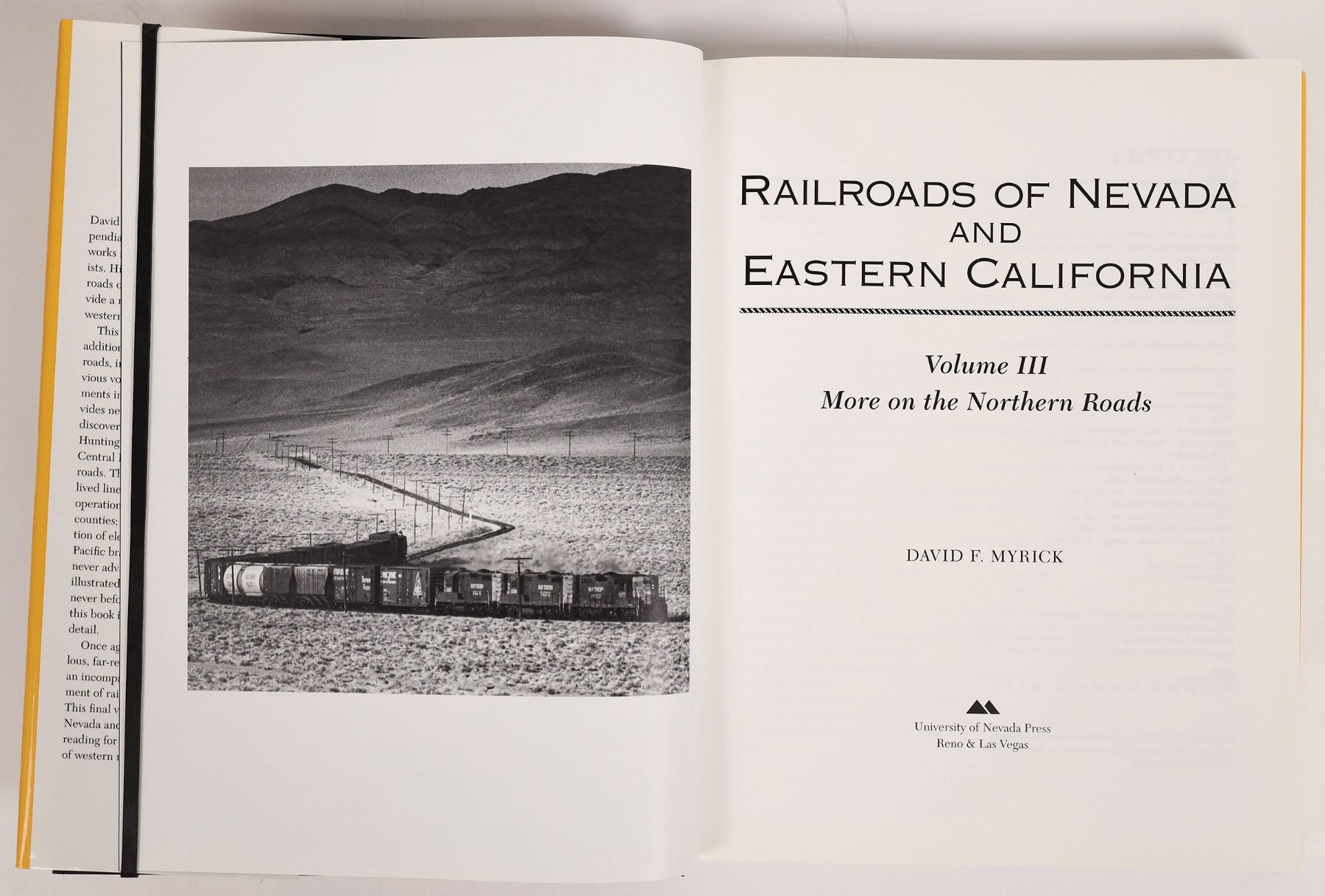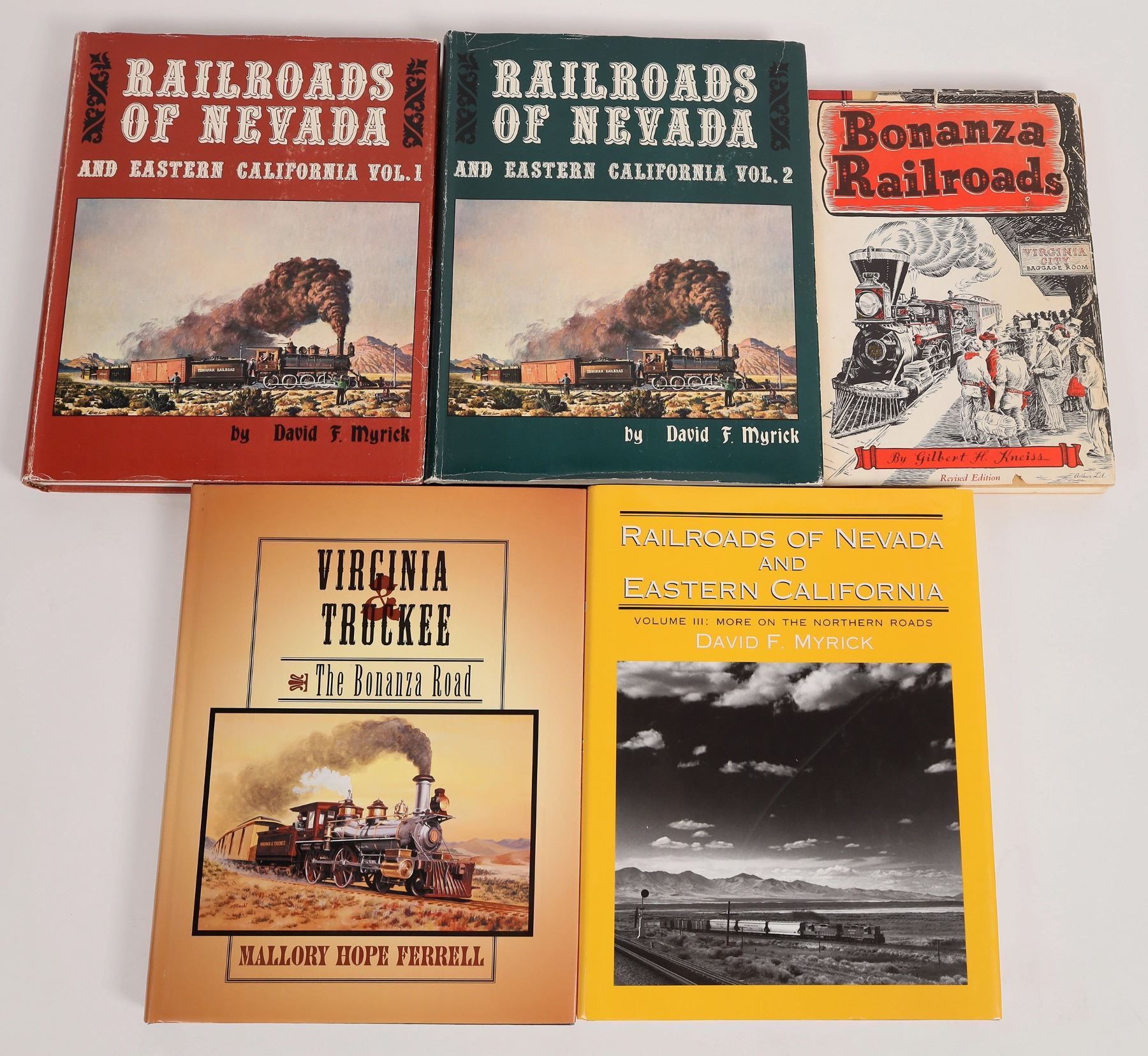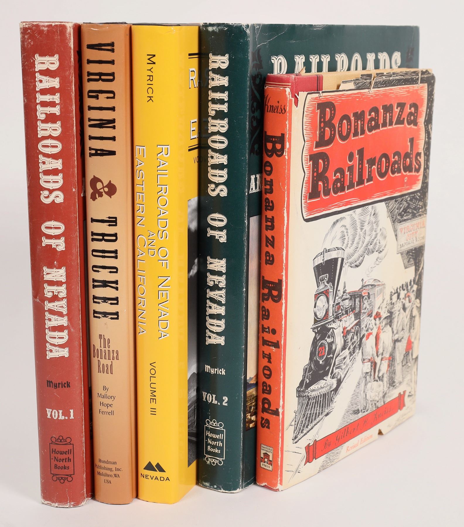 Lot of 5 different Nevada railroad books. 1-3) Railroads of Nevada by Myrick, Vols. 1-3. All first edition hardcovers with original dust jackets. a) Volume I. 1962. 443pp. A record of over forty-three railroads of Northern Nevada, many of them never before chronicled. A great deal of information is provided about the economic history of Nevada and the eastern slope of the Sierra, as it is as much a history of the region as it is a railroad book. Much on Chinese and Irish track gangs who built the railroads, as well as European capitalists who provided the money for greater expansion. Many industries are discussed including mining and gold mining, lumber and timber, fiberboard mills, etc. b) Vol. II, 1962. The author expands the history of the economic development and railroad expansion into Southern Nevada and Eastern California, from Death Valley and the Mojave Desert to the hard rock tunnels of Goldfield and the isolated communities of Rhyolite and Pioche. Much on silver mines. c) Vol. III. 392 pp., preface, acknowledgments, chronological list of selected events, illustrated from photographs, maps and charts. Covers short lines and lumber trains. 4) Virginia & Truckee, The Bonanza Road by Ferrell. 1999 hardcover 1st edition. 300pp. with many photos. 5) Bonanza Railroads by Kneiss. Revised edition 1963. Hardcover 187 pp. 14 pp. photographs, with numerous textual drawings. History of the short-lived rail lines that were constructed in Nevada and Northern California during the gold and silver booms, including the Sacramento Valley Railroad, San Francisco and San Jose Railroad, the Virginia and Truckee Railroad, the Eureka and Palisade lines, and the Nevada Central Railroad. Nevada Franklin Collection