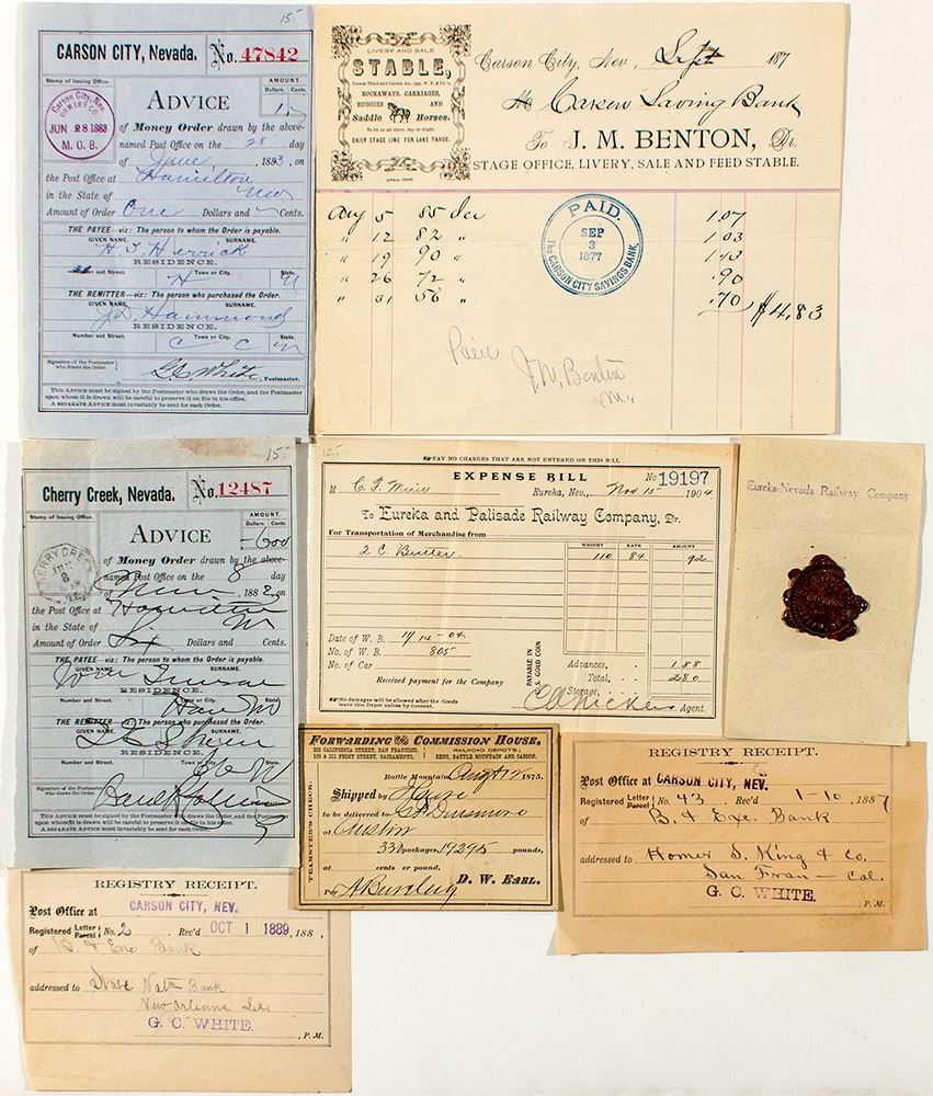 Eight pieces. Railroad: a Wells, Fargo & Co. Express wax seal for the Eureka-Nevada Railway Company and an Expense Bill from 1904 for the Eureka & Palisade Railway Company. Both in good condition.