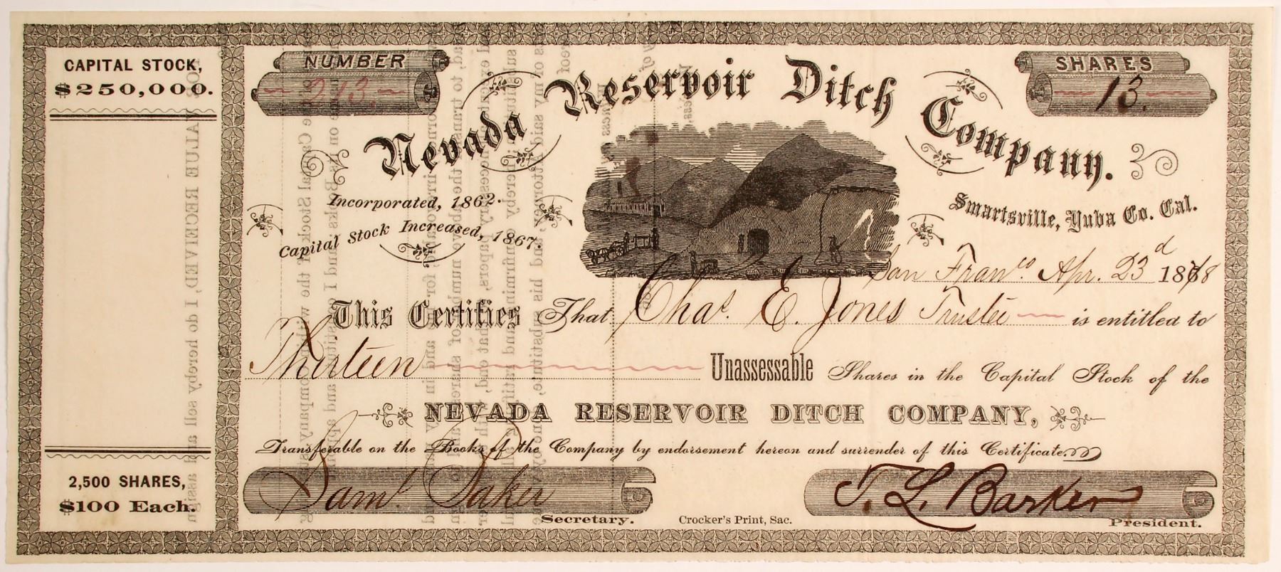 # 278 for 13 shares to Charles E Jones. Datelined San Francisco 1878. Signed by secretary Samuel Baker and TL Barker. Incorporated in 1862 with a stock increase in 1867. Location "Smartsville, Yuba Co., Cal." Crocker's Print, Sac. No edge, corner, discoloration or pinhole issues. Not Cancelled.Not in Filer. "The Nevada Reservoir Ditch Company takes 1,000 inches of water from Wolf creek, and supplies Sucker Flat and Mooney Flat. The main ditch is 28 miles long, and in that distance there are not more than 600 feet of flume, the highest 12 feet. The ditch was commenced in 1857, and finished in 1860, at a cost of $116,000. The company does not sell any water, but uses it all on Sucker Flat, in its own claims. There has been no washing at Mooney Flat for two years. " [Resources of the Pacific Slope by Browne] Prag Collection