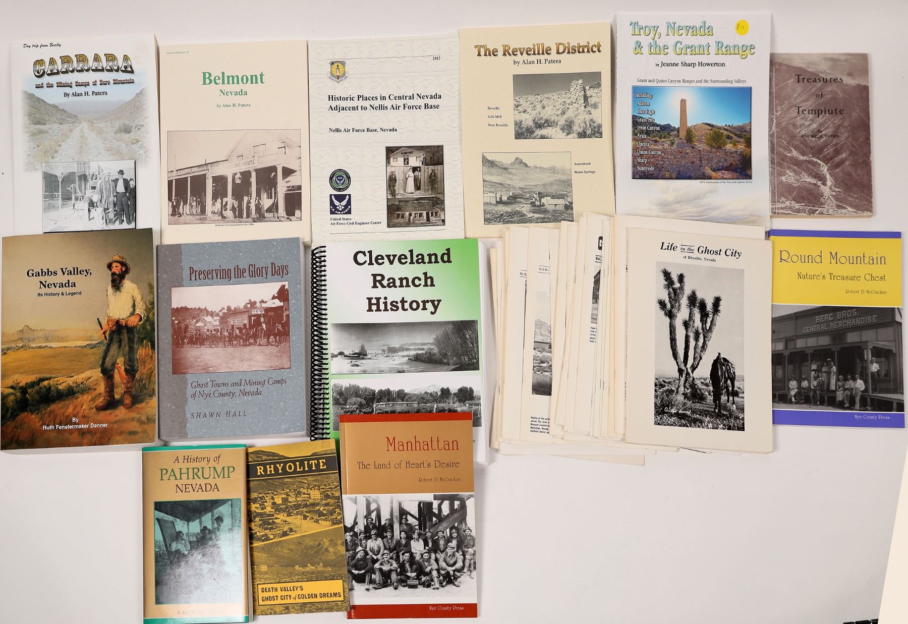 Thirty-five pieces. Key pieces are Treasures at Tempiute by Koyen 1967 and Cleveland Ranch History (Geyser, Negro Creek, Roberts and Hiko Ranches). Hard cover history of Pahrump by McCracken, Preserving the Glory Days by Hall (Nye County), Troy, Nevada by Howerton, Reveille District by Patera, Historic Places of Central Nevada by Nellis Air Force Base, Round Mountain by McCracken, Manhattan by McCracken, Belmont by Patera, Carrara by Patera. Twenty-two 1980's and 90's Glorious Past from the Central Nevada Historical Society (goldfield, Tonopah Manhattan, Rhyolite, Gordon, planes, trains, automobiles and ships!). AND Gabbs Valley by Danner. Signed by author. 414 pages of information.