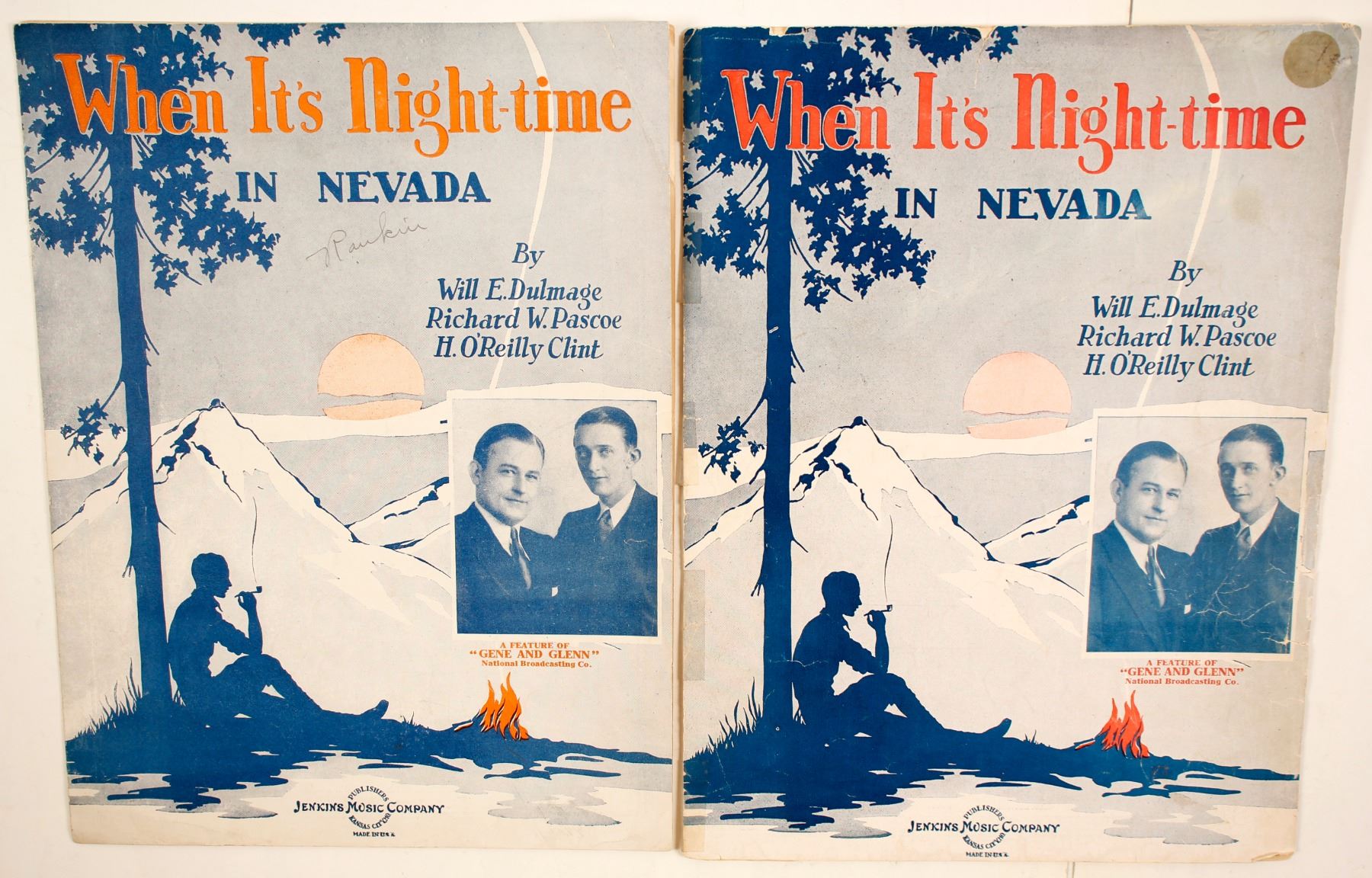 2 pieces of sheet music with "When It's Night-Time in Nevada' by Will E. Dulmage, Richard W. Pascoe & H. O'Reilly Clint; also has "You're Just a Flower from an Old Bouquet.