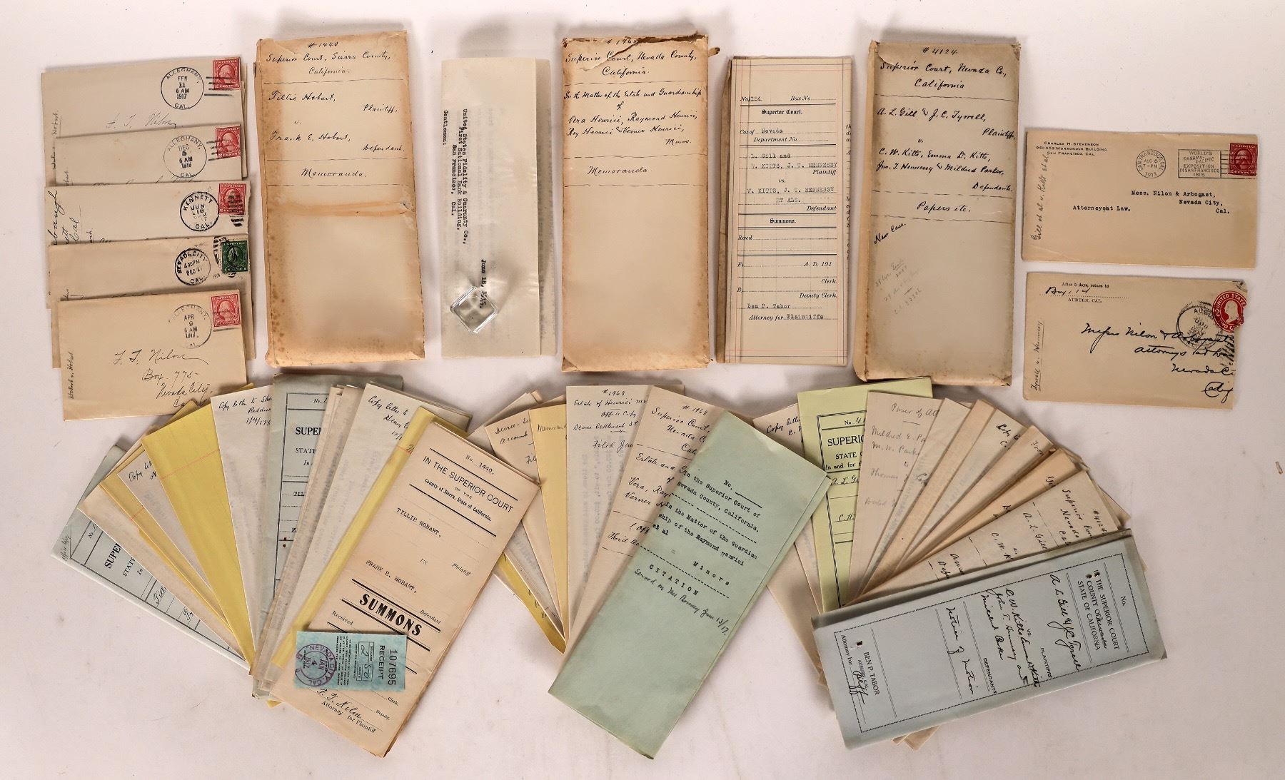 Sierra & Nevada county legal papers and court briefs filed in both Nevada and Sierra Counties in the early 1900s. First packet is from Superior Court in Sierra County. It has what appears to be a divorce action between Tillie Hobart and Frank Hobart. Nest is a packet from Nevada County with various legal briefs & papers and the third, more legal briefs from Nevada County. A unique lot. Please see photos for more details. Nevada/Sierra County California