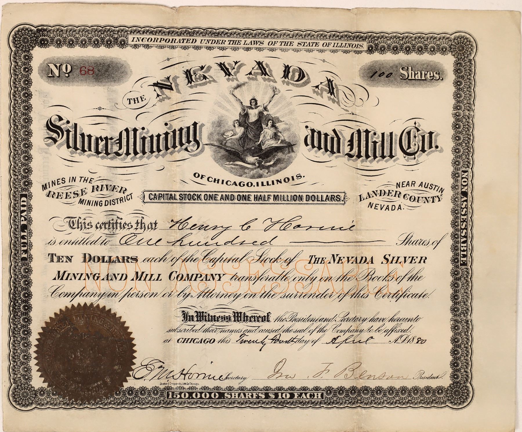 Rare. "Mines in the Reese River Mining District Near Austin, Lander County, Nevada" printed under the title. Inc. in Illinois. No. 68, issued for 100 shares to Henry Horine in 1880. Signed by president Ira Benson and secretary E. Horine. Not cancelled. Black border and print, silver seal, and allegorical vignette. Printed by Shaber & Corqueville, Chicago. 8.75 x 10.5" Deep folds, creases. No other information located.