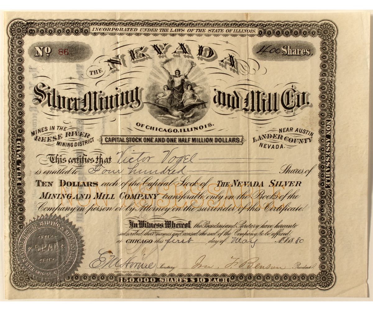 Reese River Mining District. Early number 86 for 400 shares to Victor Vogel in 1880. Signed by Jno Benson and EM Howie. Orange under print that reads "Non Assessable". Large silver-colored company seal. Black border and black ink. Small vignette of three women sitting on a bald eagle. One appears to be holding two torches, another holding painting materials and the third holding a pencil and a book. Endorsed on the reverse by Vogel. Outside of folds in near perfect condition.